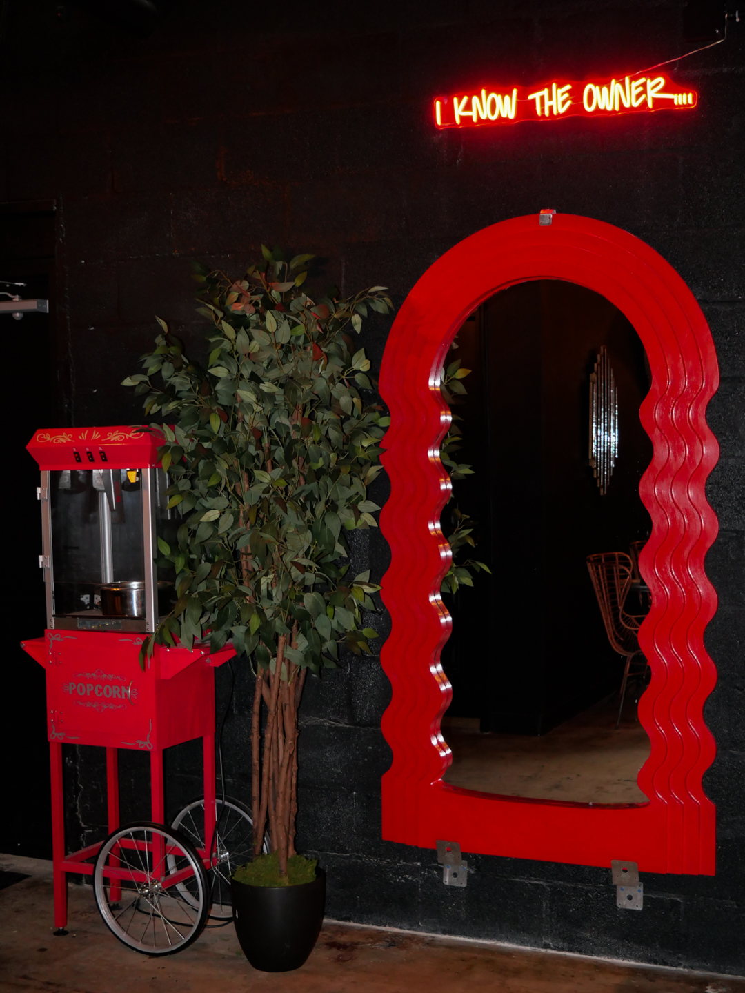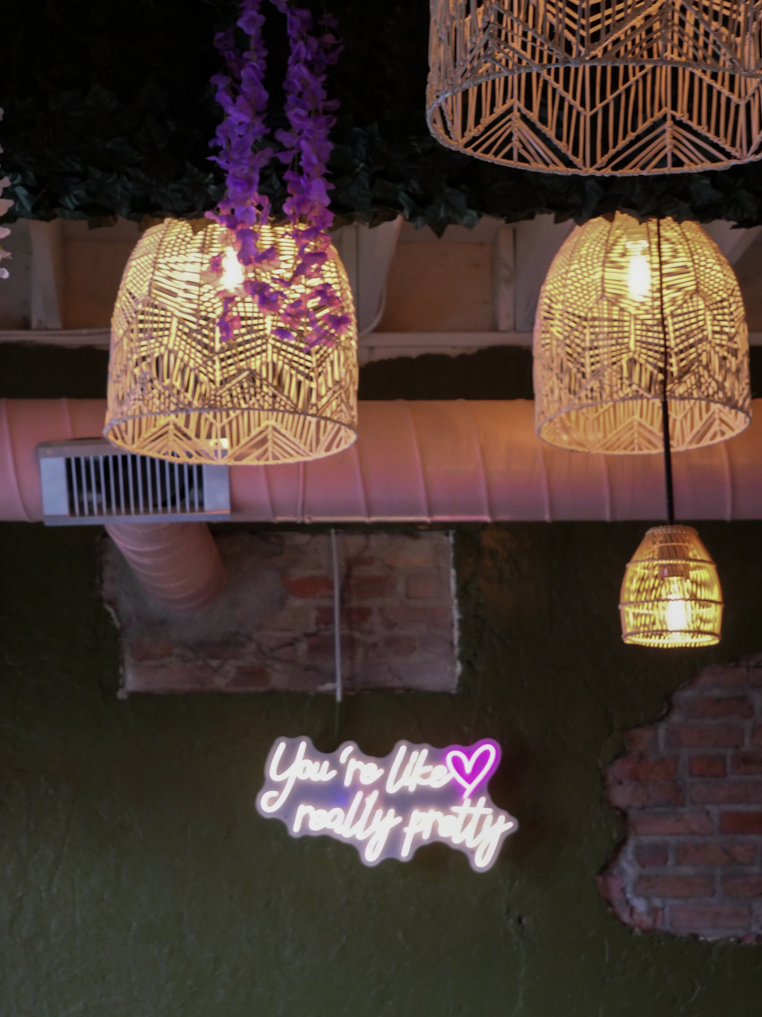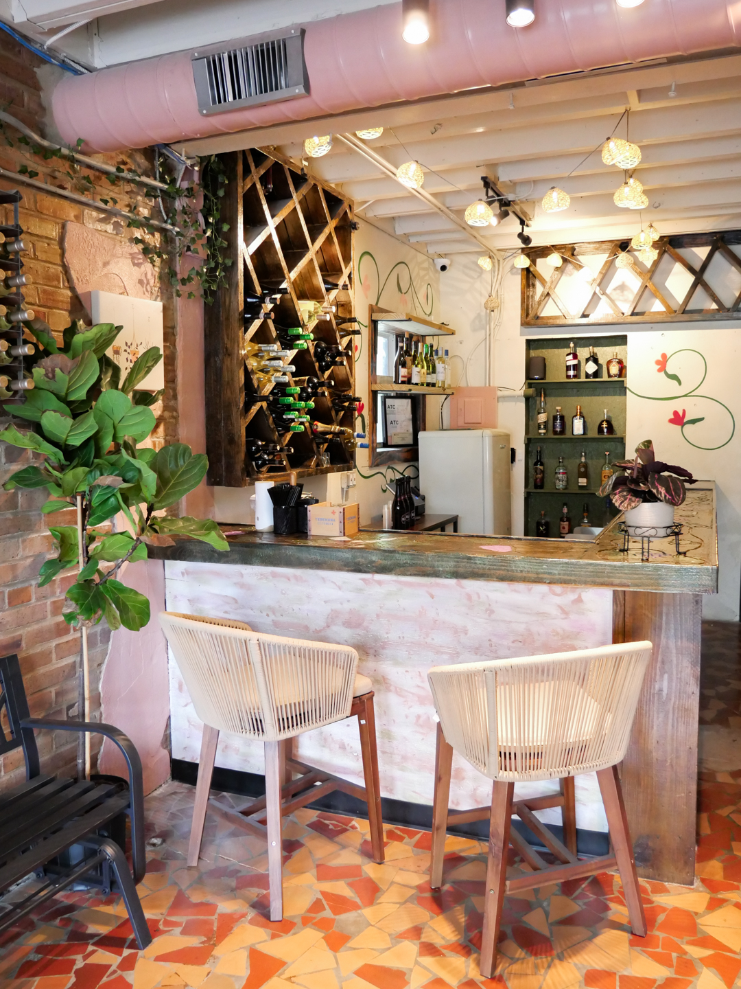 Making a bold first impression, the front doors open to a swanky, well-stocked wine bar decorated with glitzy photos of the four Golden Girls. In the adjoining room, whimsical florals hang over couches and chairs that serve as extra seating and a daytime workspace. The moody, alluring lounge area follows, bringing a nightclub feel to the venue, which features bottle service and hookah.