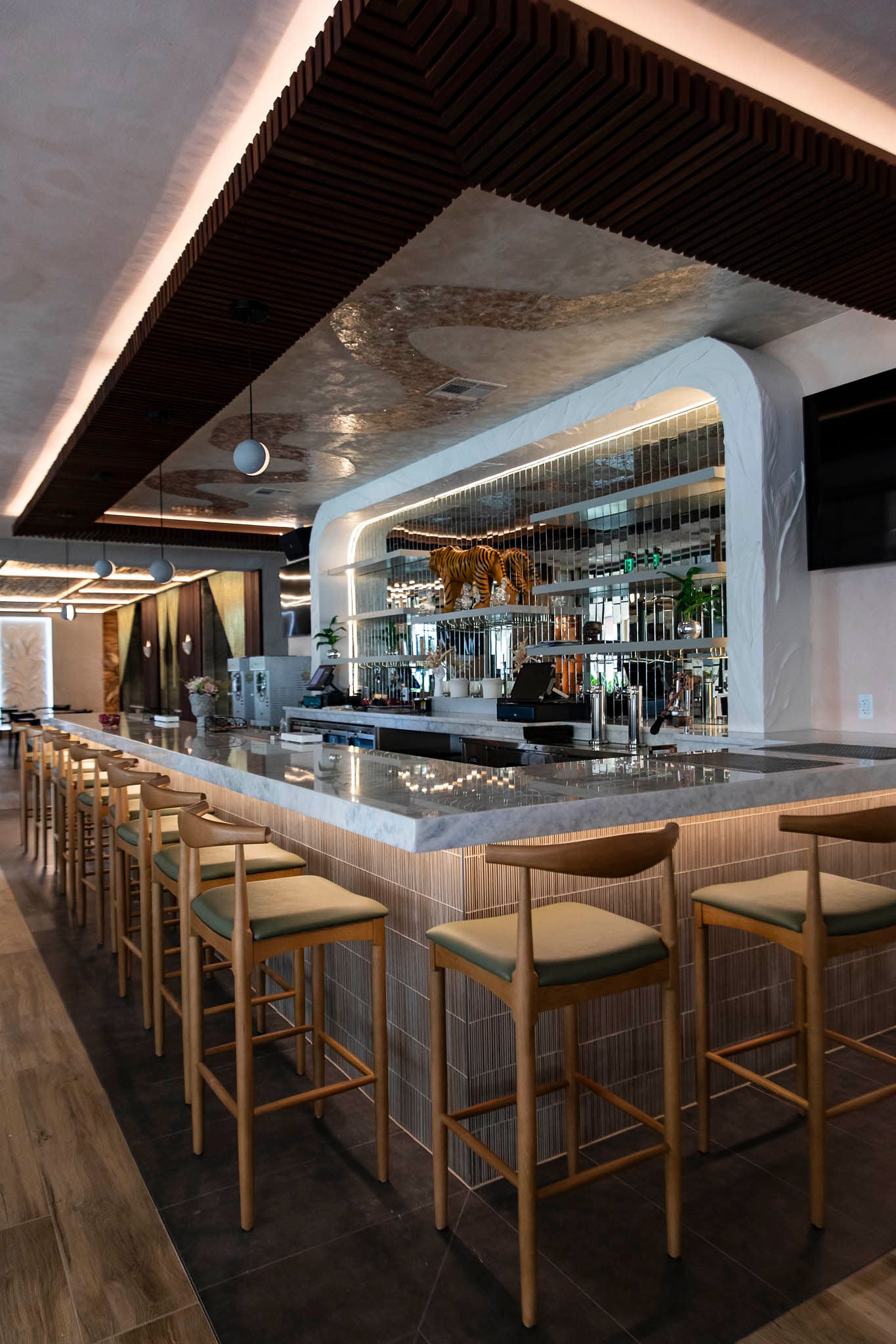 At the bar, a tiger figure is the centerpiece of a mirrored wall, a nod to Baton Rouge. Be sure to look up—slithering, hand-placed stones in the shape of a snake decorate the ceiling. Bartenders will shake up hand-crafted cocktails, like the Pork Decision, a tropical beverage served in a pink terracotta glass shaped like a piglet.