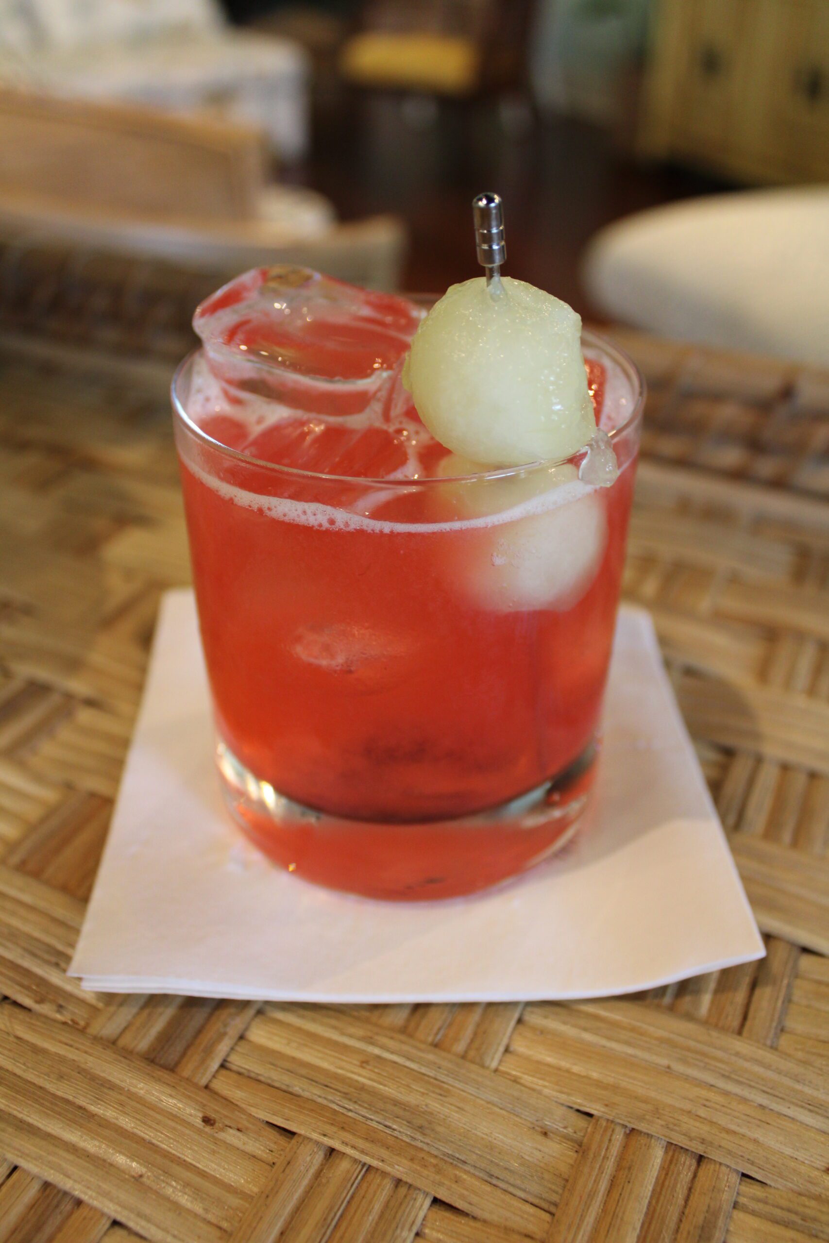 Muddle raspberries and add them to your shaker with the rest of the ingredients. Depending on the sweetness of your raspberries, add more syrup as needed. Use a strainer when pouring over a glass of ice, and garnish with honeydew melon balls.