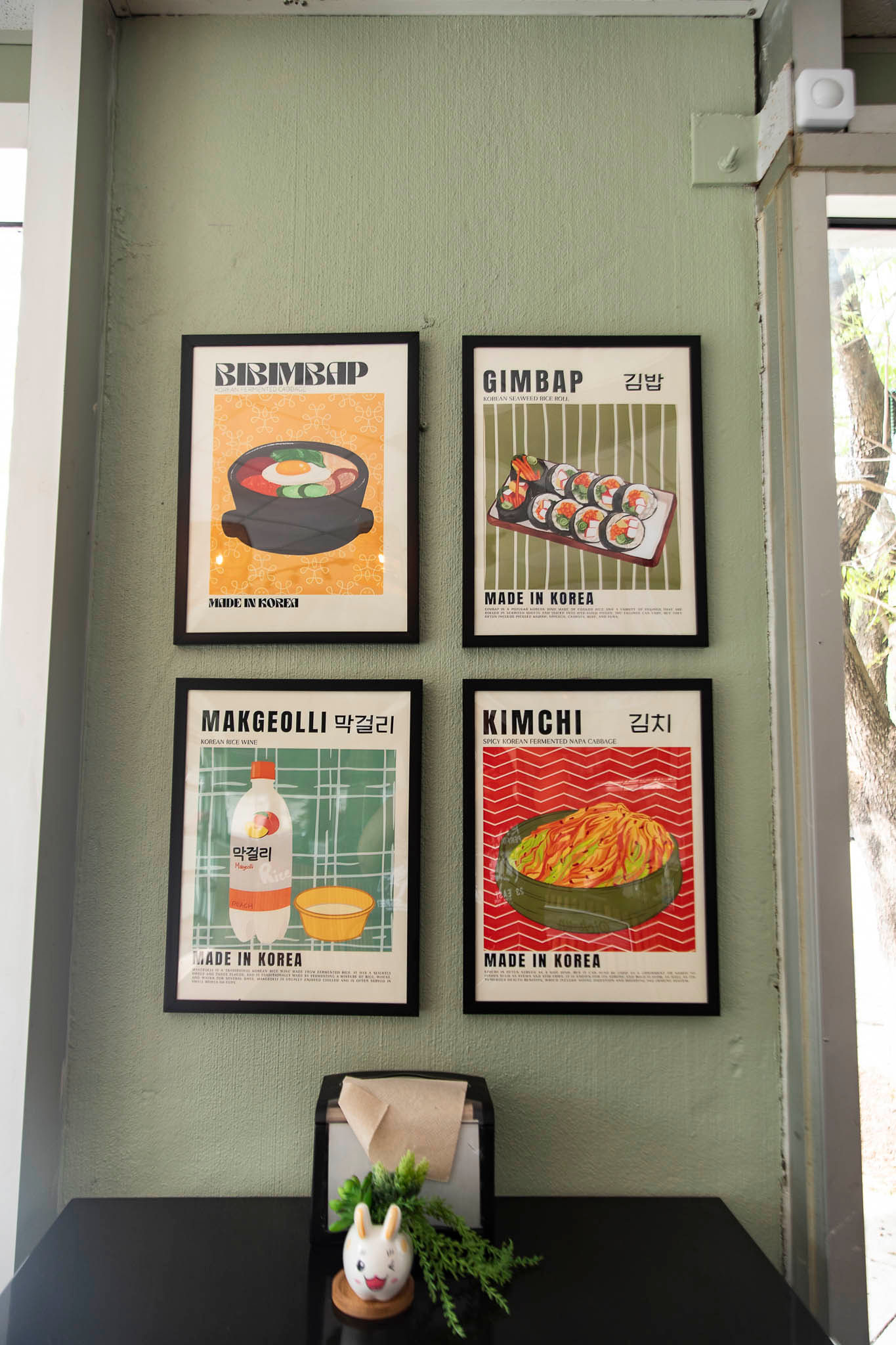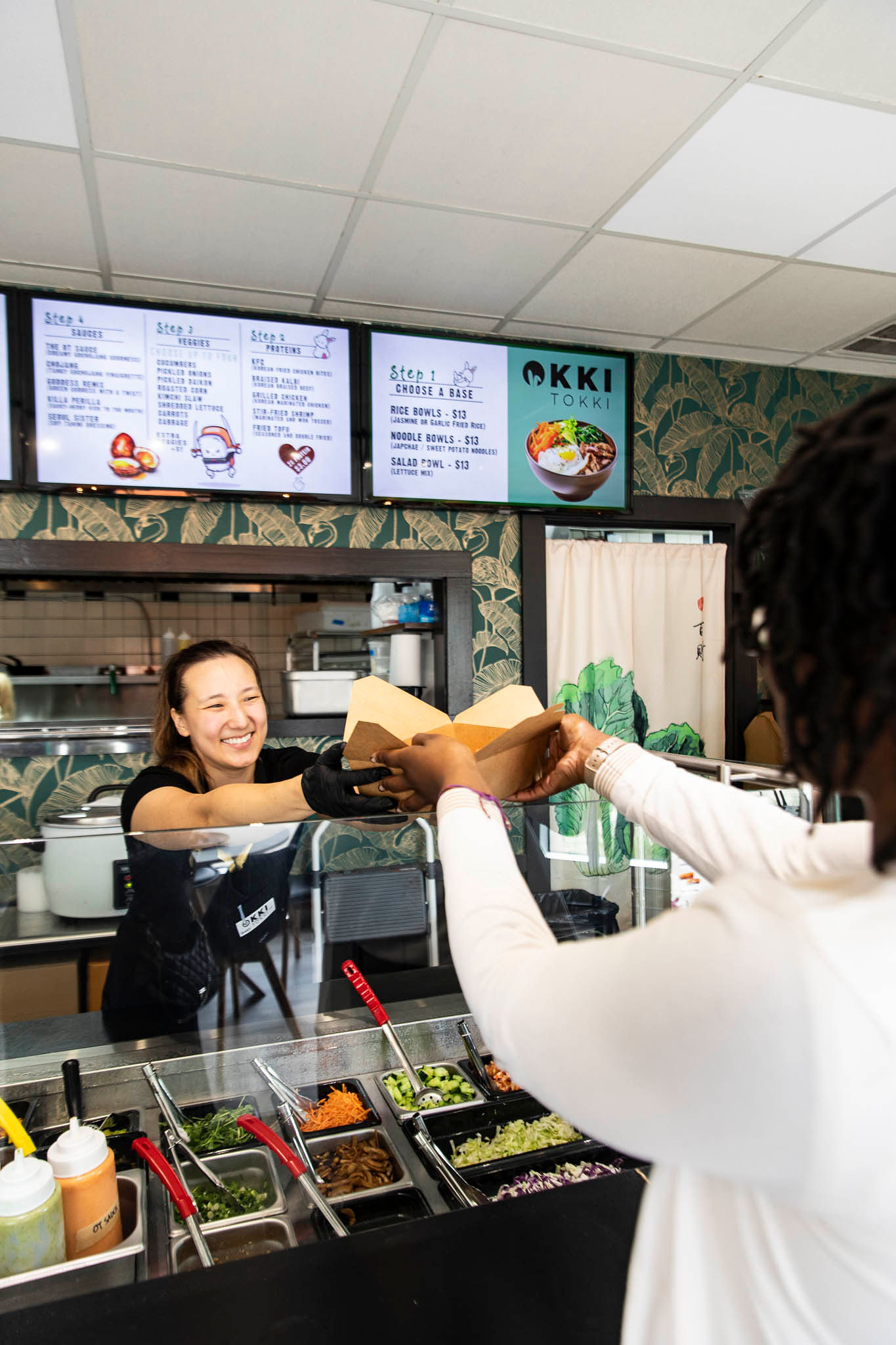 Green is a lucky color in Korea, and Okki Tokki is filled with it. The dining area walls are awash in a soothing sage, and a tropical wallpaper frames the menu signs behind the front counter.