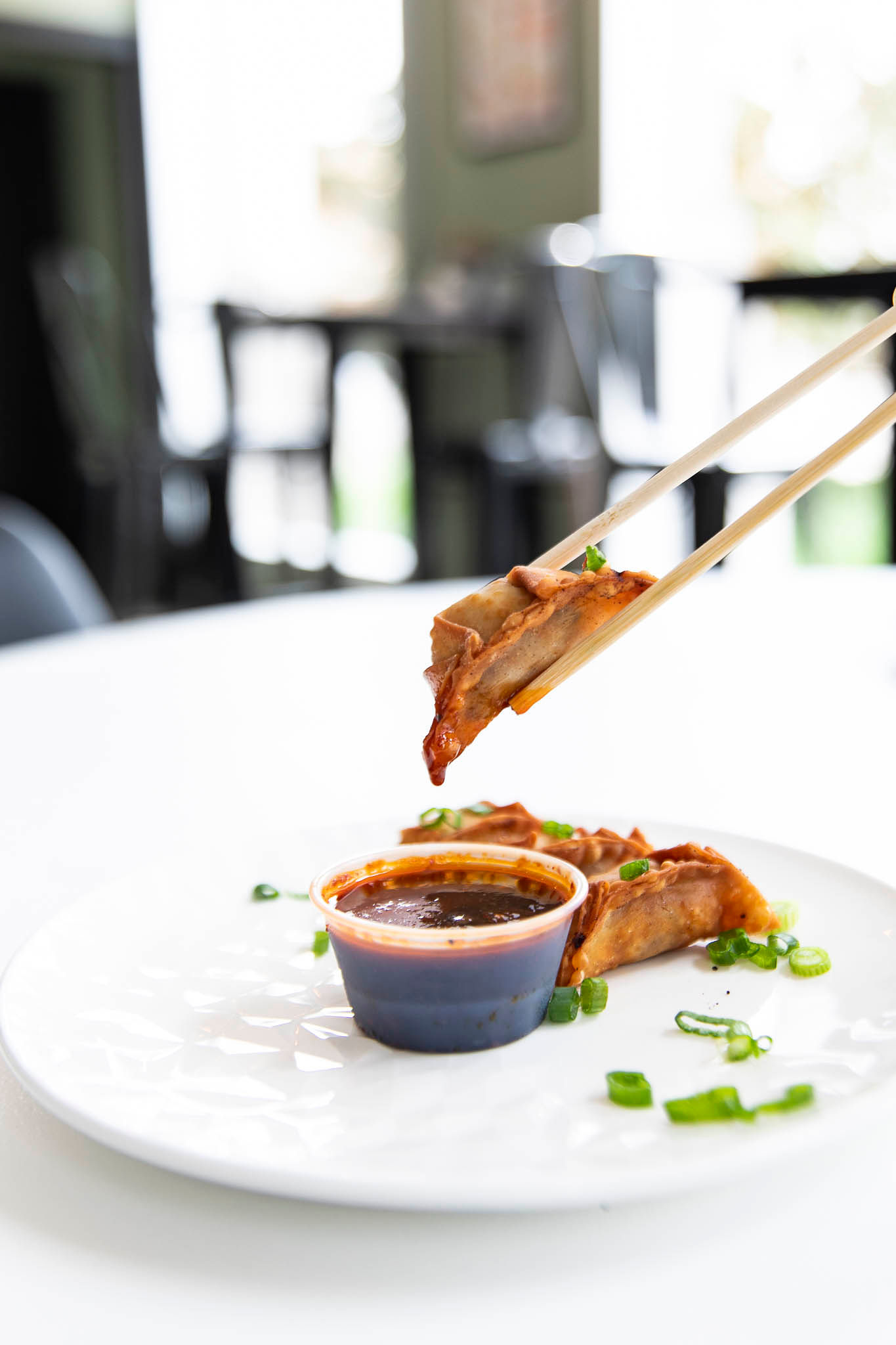 The restaurant’s smaller footprint and to-go concept means limited seating capacity, but there is space for about 25 people. Customers can gaze out at Main Street from window-facing high-tops, or they can plop down on a couch in a lounge-y corner and admire the Korean-inspired art on the wall. Group seating at a large rectangular table is staged in front of a greenery wall and neon sign, ripe for a photo op.
