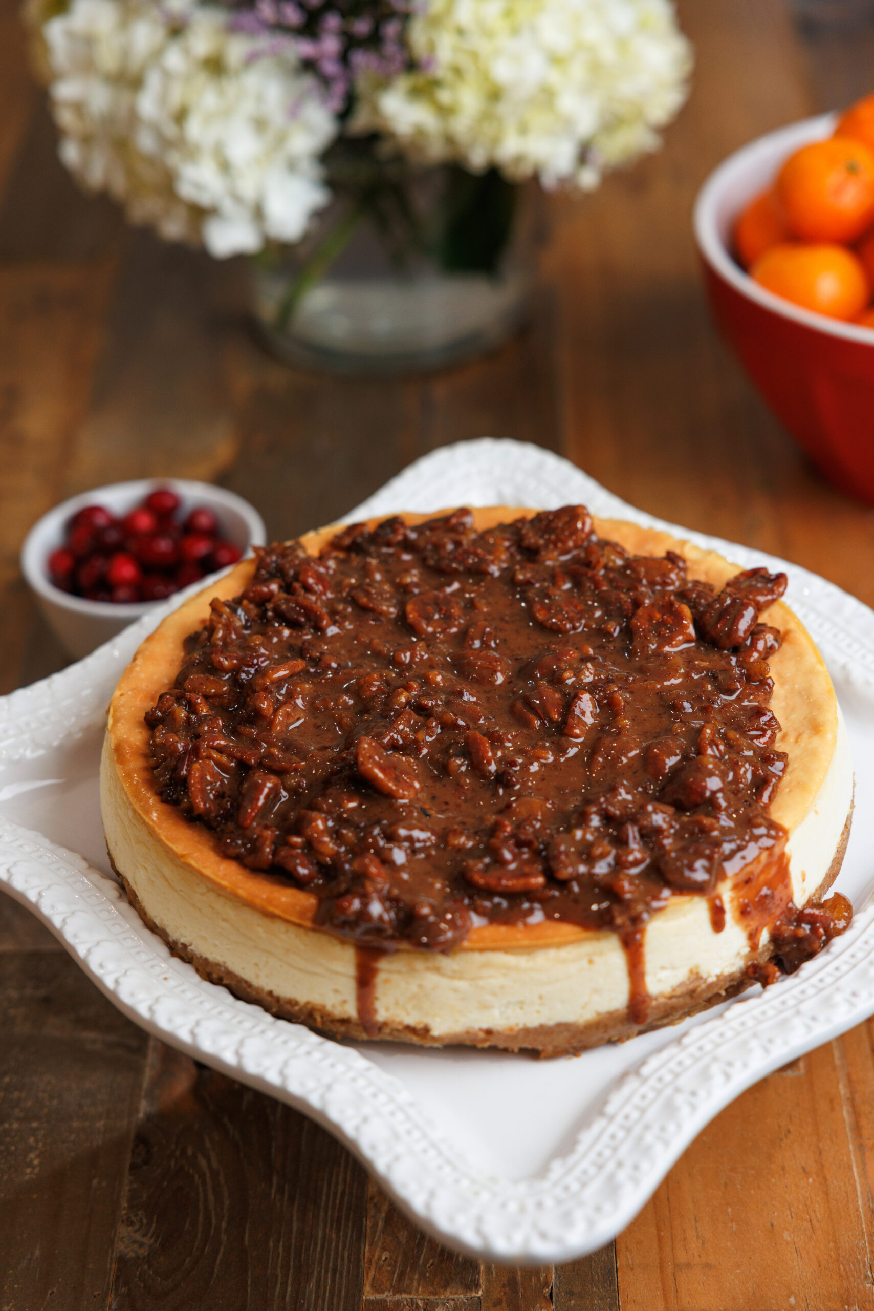 Cheryl calls it New York style; I call it a delicious showstopper. Topped with the bourbon praline sauce, it’s a lovely holiday finale. In the summer, Cheryl adds a tablespoon of lemon juice to the batter and tops it with a mountain of fresh berries.