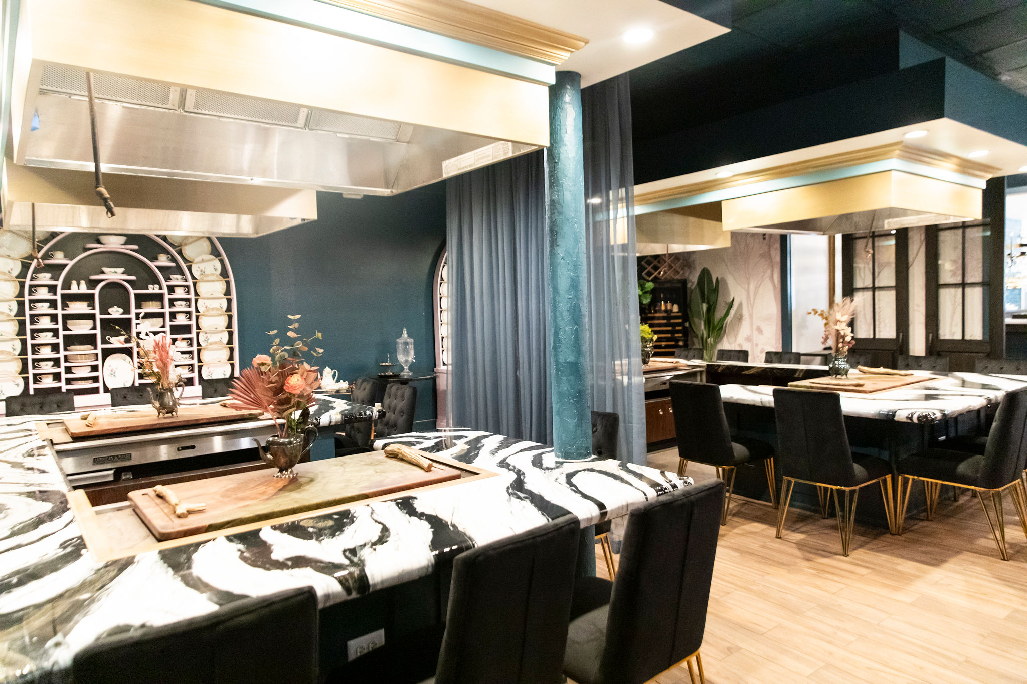 The far side of the restaurant features a separate room with former hibachi tables now outfitted with decorative glossy black-and-white epoxy surfaces and flanked by black-and-gold chairs. Soft draperies add splashes of color, and one wall is bedecked in arched nooks that hold different patterns of estate sale china. The tables are intended to give patrons a place to enjoy “communal experiences,” according to Crifasi. That includes wine tastings featuring her line-up of mostly organic, natural wines and high tea with all the trimmings on Sundays.
