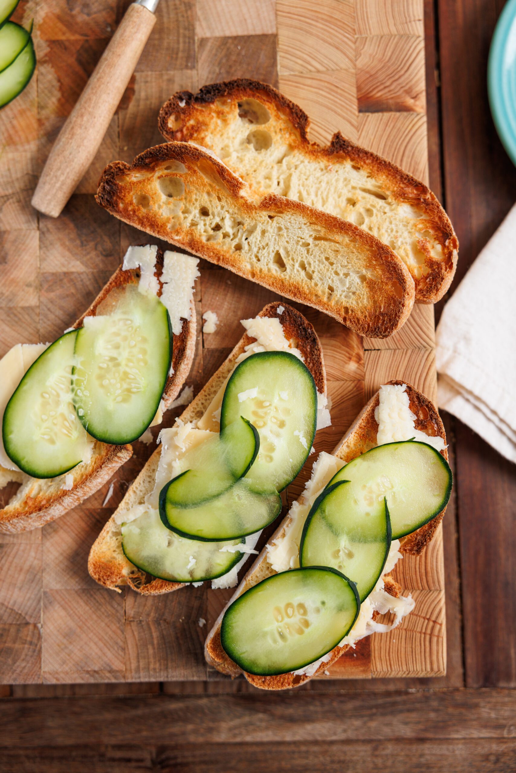 Lay out toasted ciabatta and top each piece with overlapping slices of cheese. Top artfully with sliced cucumber and serve almost immediately.