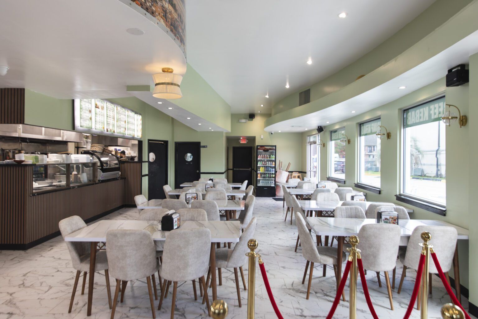 The interior of the fast-casual eatery is bright and cheerful, with cushioned seating, faux marble tables and flooring, and elevated murals of Jerusalem.