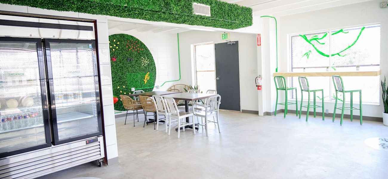 The convenience store turned wellness bar is clean and green. The grey concrete floors and white walls accented by green pipe light fixtures and plants create a bright and open atmosphere.