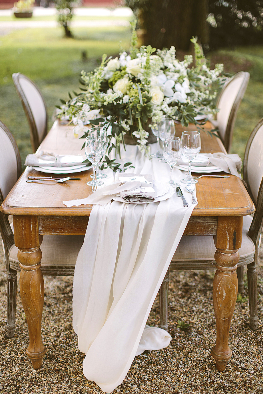 “Outdoor parties are always gorgeous,” says Angela DiVincenti Babin, owner of Angela Marie Events. “String festoon lights and use lots of beautiful candles if your meal goes past dark.”