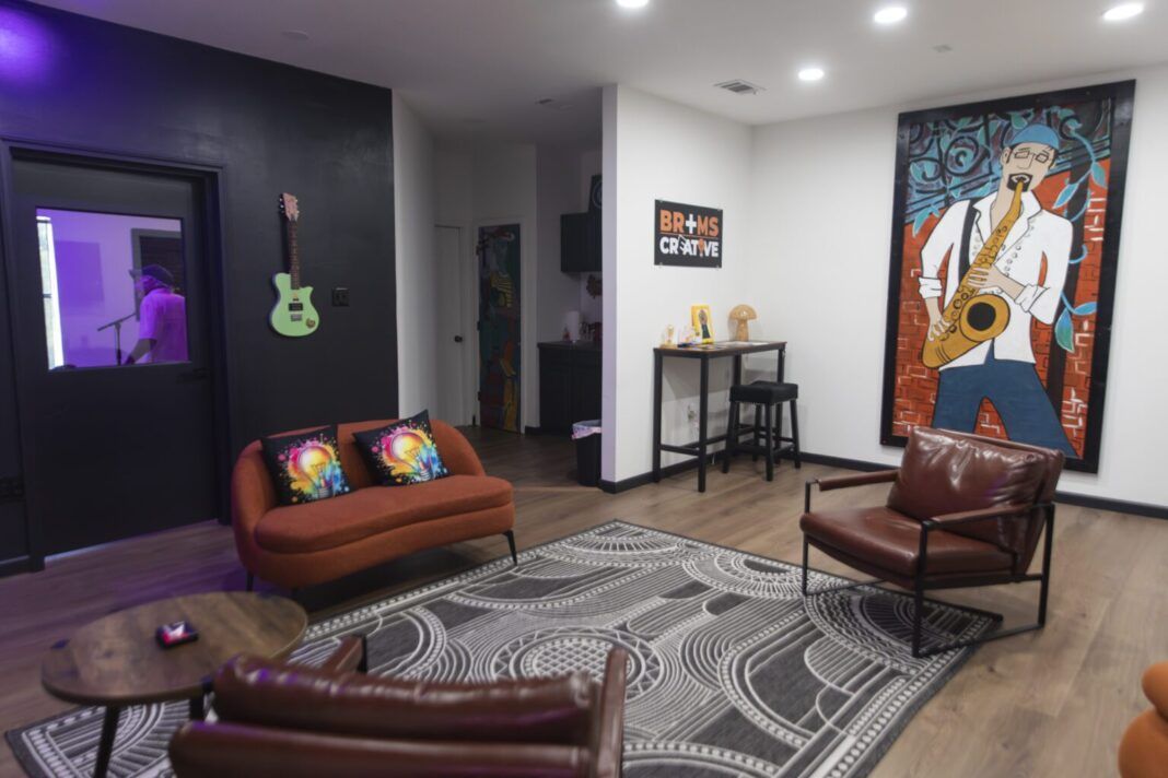 BRMS Creative is set up to be inviting to both musicians and their friends and family. There are multiple lounging areas, with funky art that reflects creatives at work. Instruments that aren’t actively being used are tucked into corners, creating a lived-in feel at the new space. Decor is detailed with deep turquoise and orange. The design is meant to inspire creativity with a welcoming, low-pressure environment.