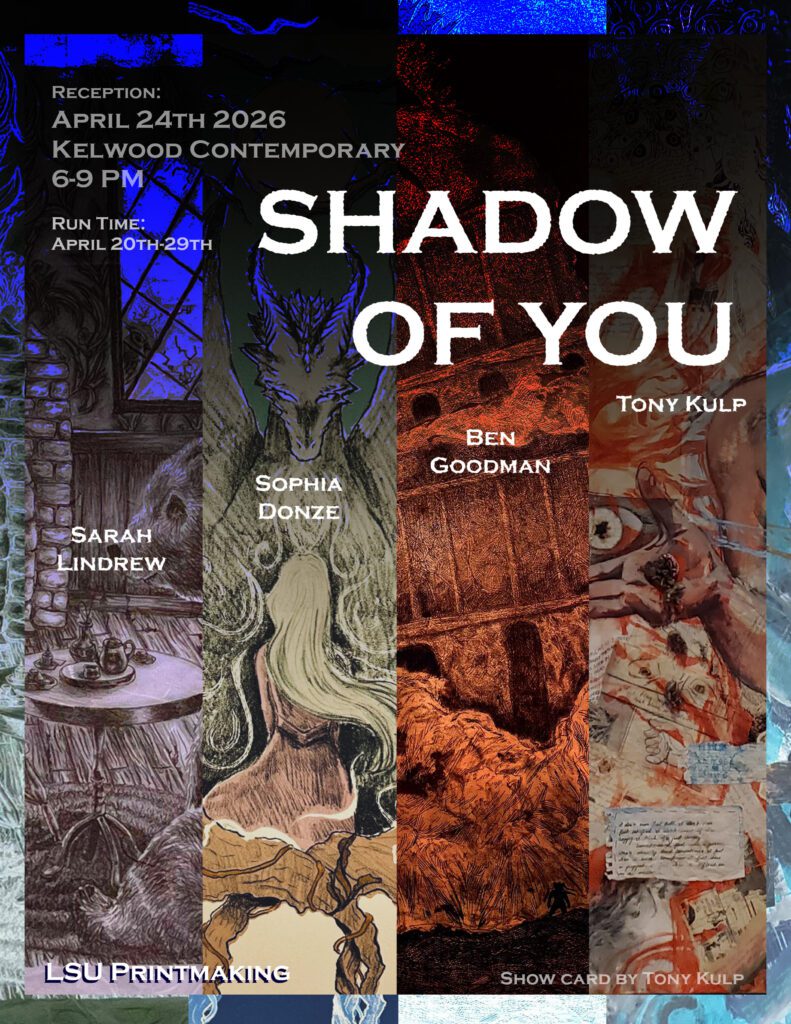 Kelwood Contemporary Art is presenting the printmaking exhibition, Shadow of You, from April 20 to 29, displaying the work of LSU printmaking students Sarah Lindrew, Sophia Donze, Ben Goodman and Tony Kulp.