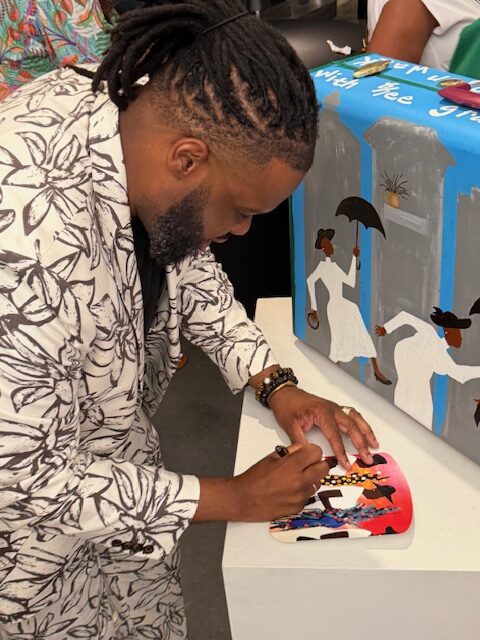 Each piece is deeply personal yet relatable, with themes and figures that represent family, friends and neighbors who have had a hand in shaping Lewis’ life and creativity. He describes his work as a reflection of his life and a creative outlet for telling his story and the stories of the people around him.