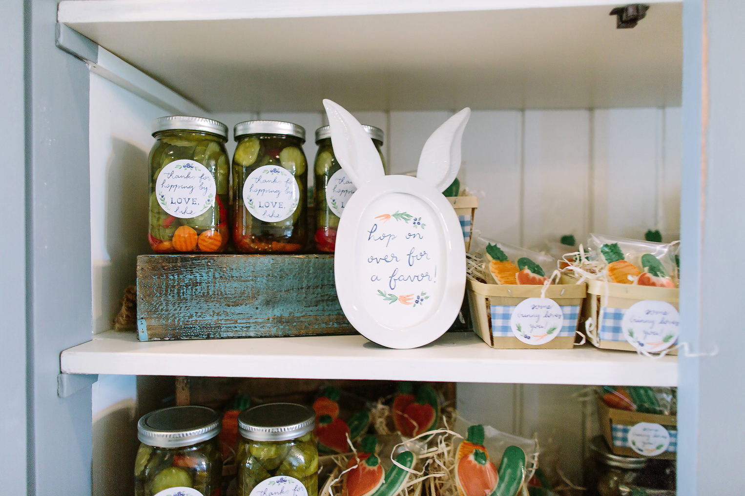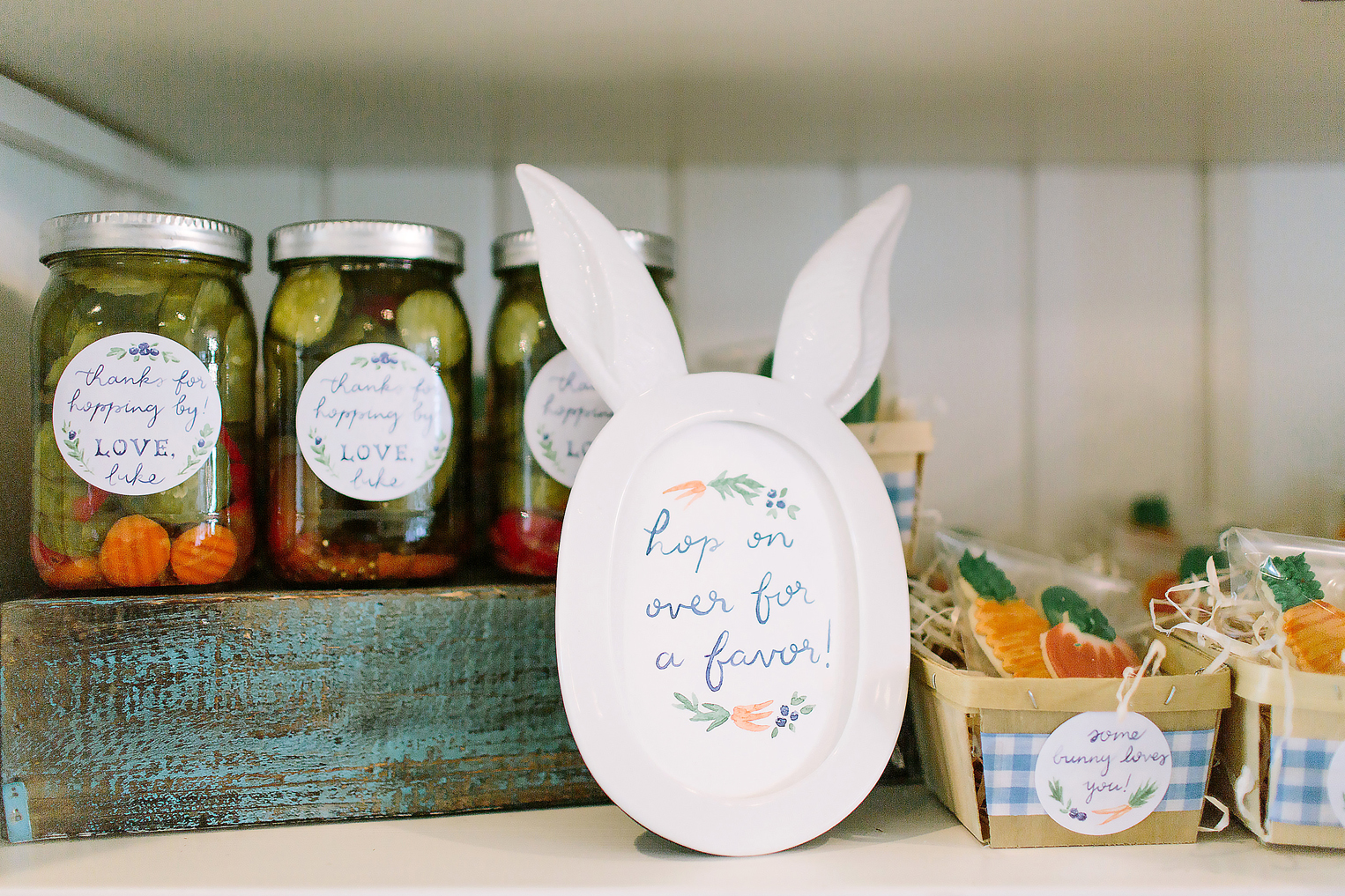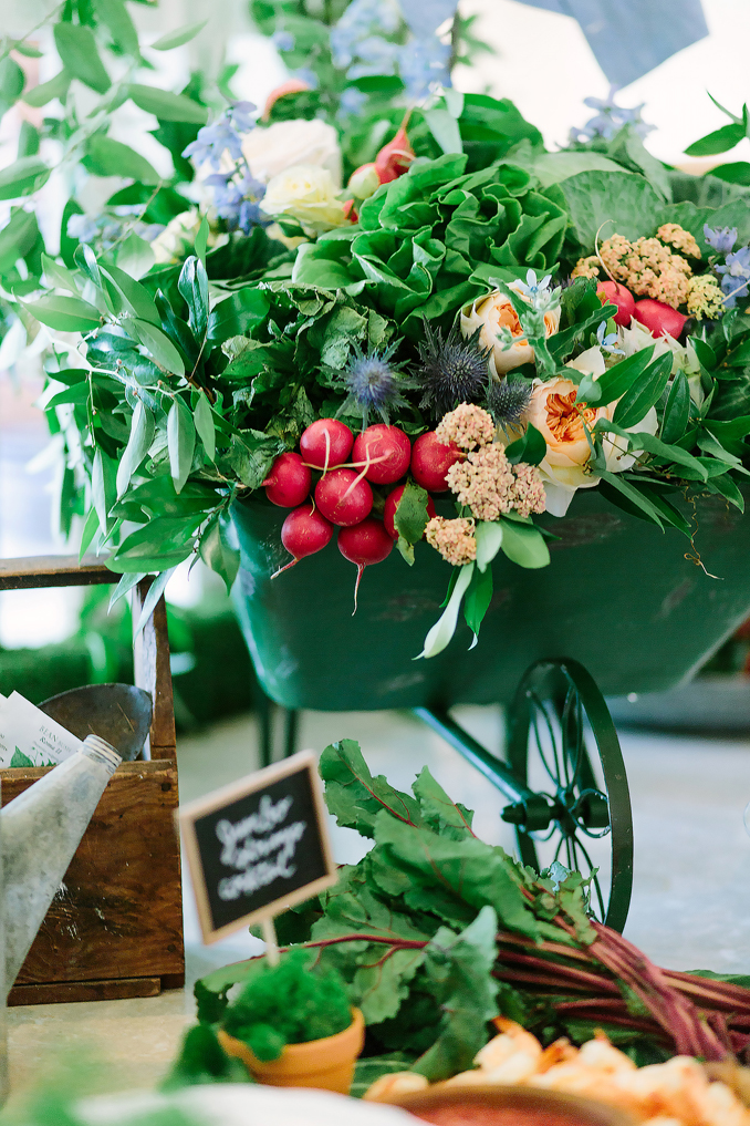 Fresh from the garden, this baby shower happily heralded a new member of the family with details that would make anyone want to jump Mr. McGregor’s fence for an afternoon snack. From the floral-stuffed wagons and wheelbarrows to the Some Bunny Loves You veggie-shaped sugar cookies, no detail was spared. And this was a great thing, because the details are still being used.
