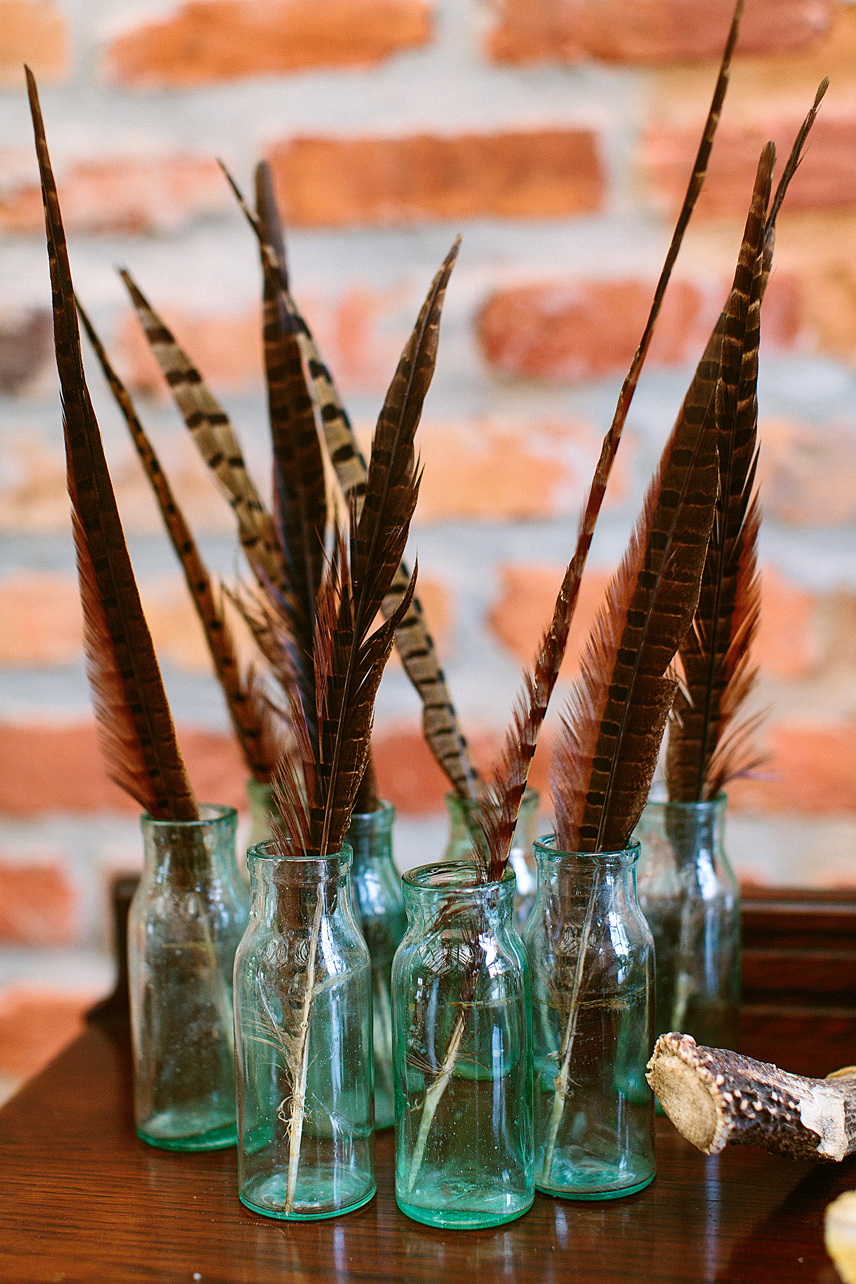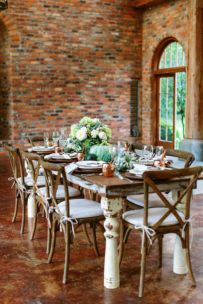 The crisp, cool days of fall call for sensational celebrations. Beautiful greens, grays and whites play a big role in this scene—forget the typical orange, red and yellow combinations. Simple and true hues from the outdoors can inspire any table setting. Pair with copper mugs, wooden chargers, antique bottles and pheasant feathers for a natural punch worthy of any indoor party.
