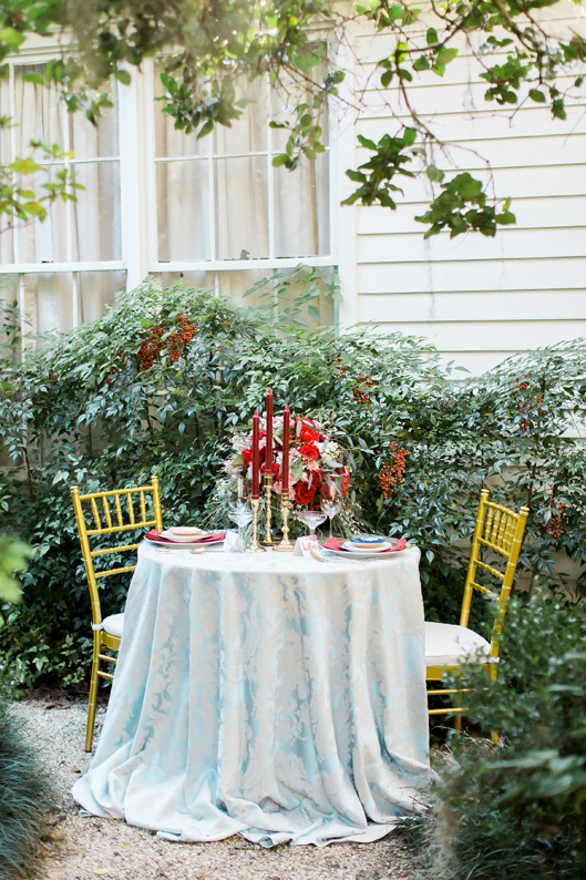 “I threw in a pretty blue tablecloth and added depth to the décor with rich maroons.”