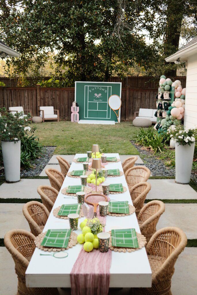 The key element was the backdrop. We wanted to include a court concept without using a physical tennis court. My husband and I recreated a court backdrop in a simple, clean way. We focused on the colors, which included a lot of deep green paired with soft pink, all throughout the party.