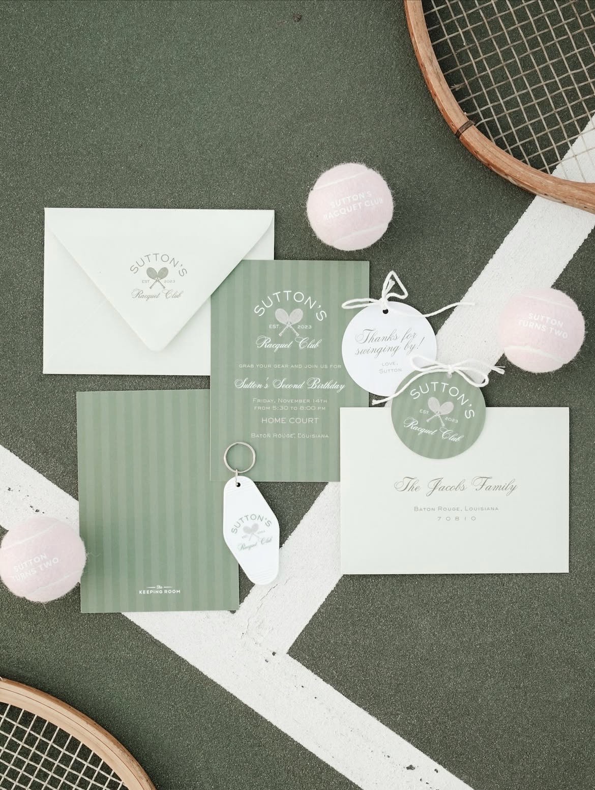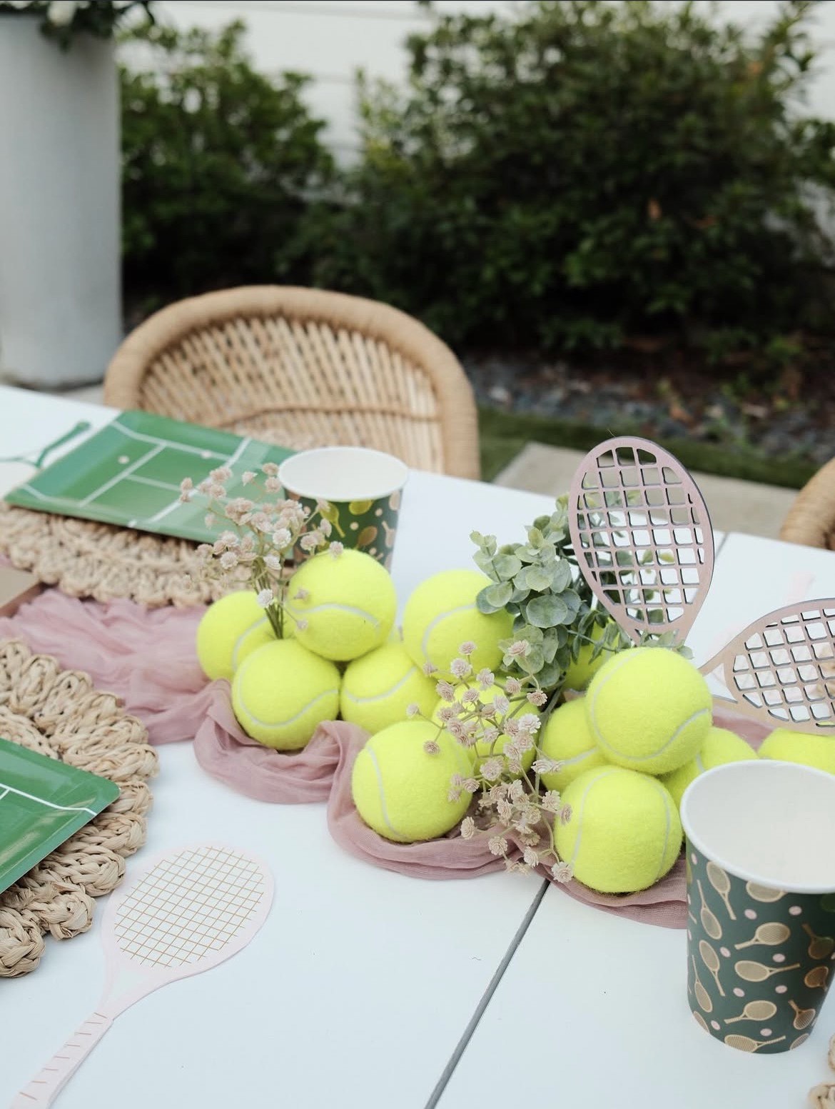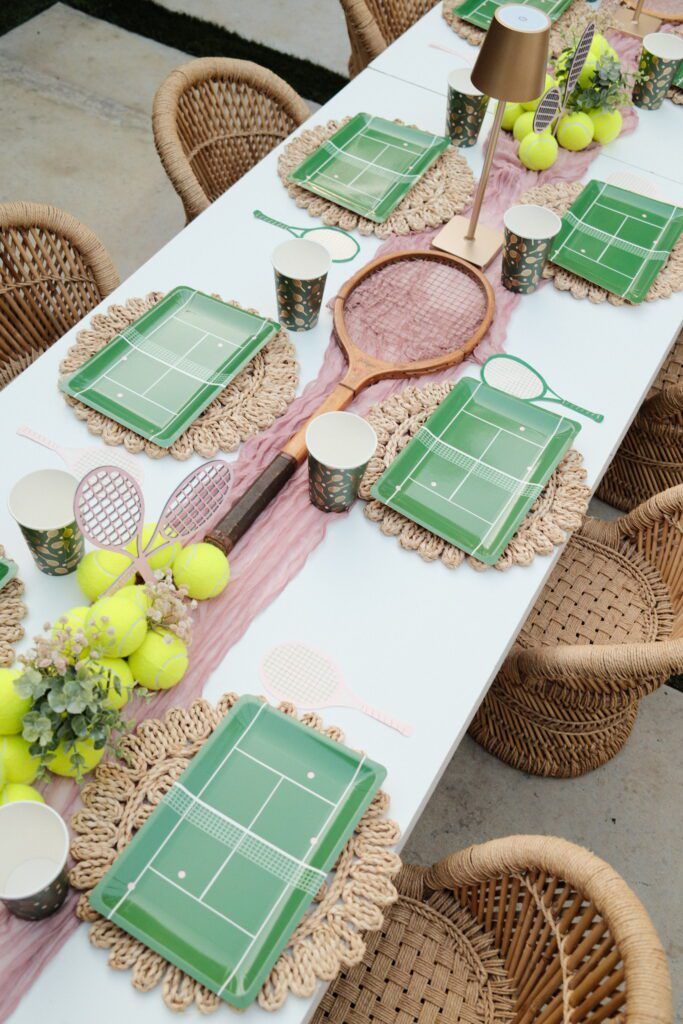 The birthday girl’s mom, Taylor Jacobs, got creative with several details. She created vases from tennis balls that included florals. We also tied in some racquets on the tables to make the whole setup cohesive and consistent with the color palette.