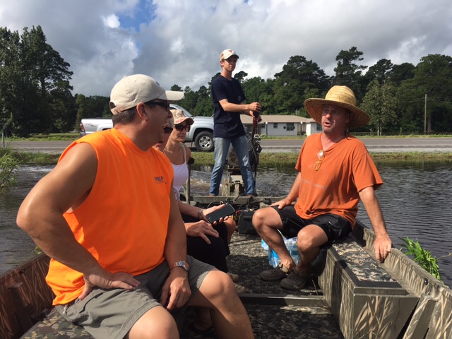 Since 10 a.m. on Saturday, August 15, Macaluso had been coordinating with Baton Rouge police to find out where his 30-man convoy of hunting and fishing buddies from Thibodaux, St. Bernard, Houma and Chalmette, with their nearly 20 boats, could have the greatest impact. They made it to North Sherwood Forest Drive and Greenwell Springs Road by mid-afternoon and fanned out as police directed them where rescues were needed most.