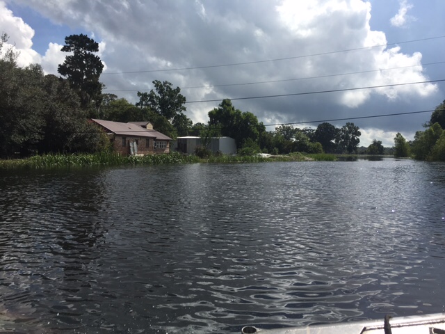Suburban streets became rivers as volunteers launched boats all over south Louisiana, including this scene in the Southpoint neighborhood of Denham Springs. Photo courtesy Jeremy Higginbotham.