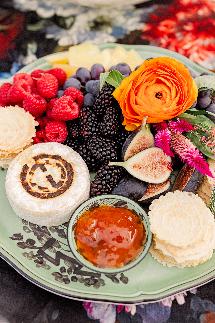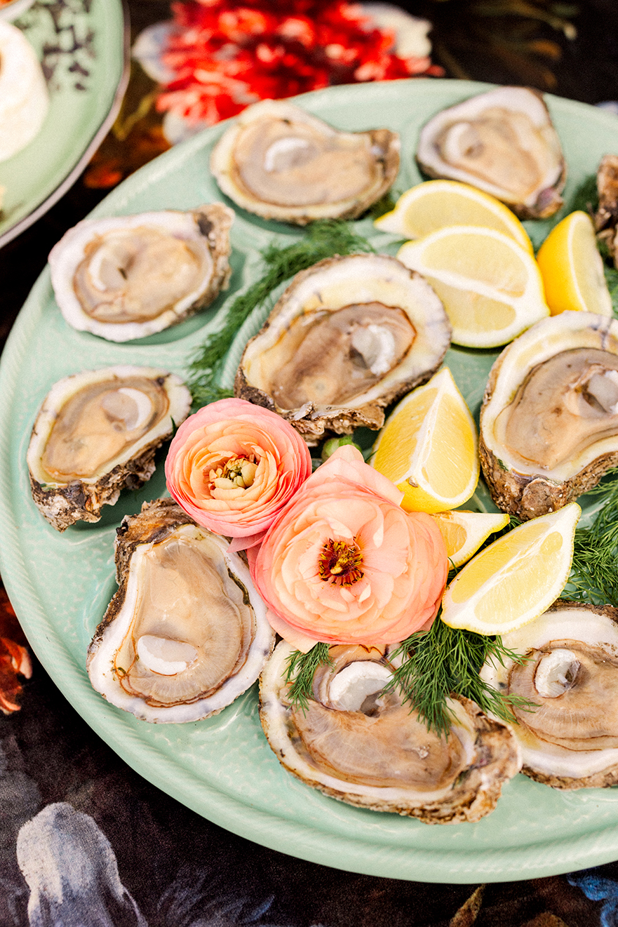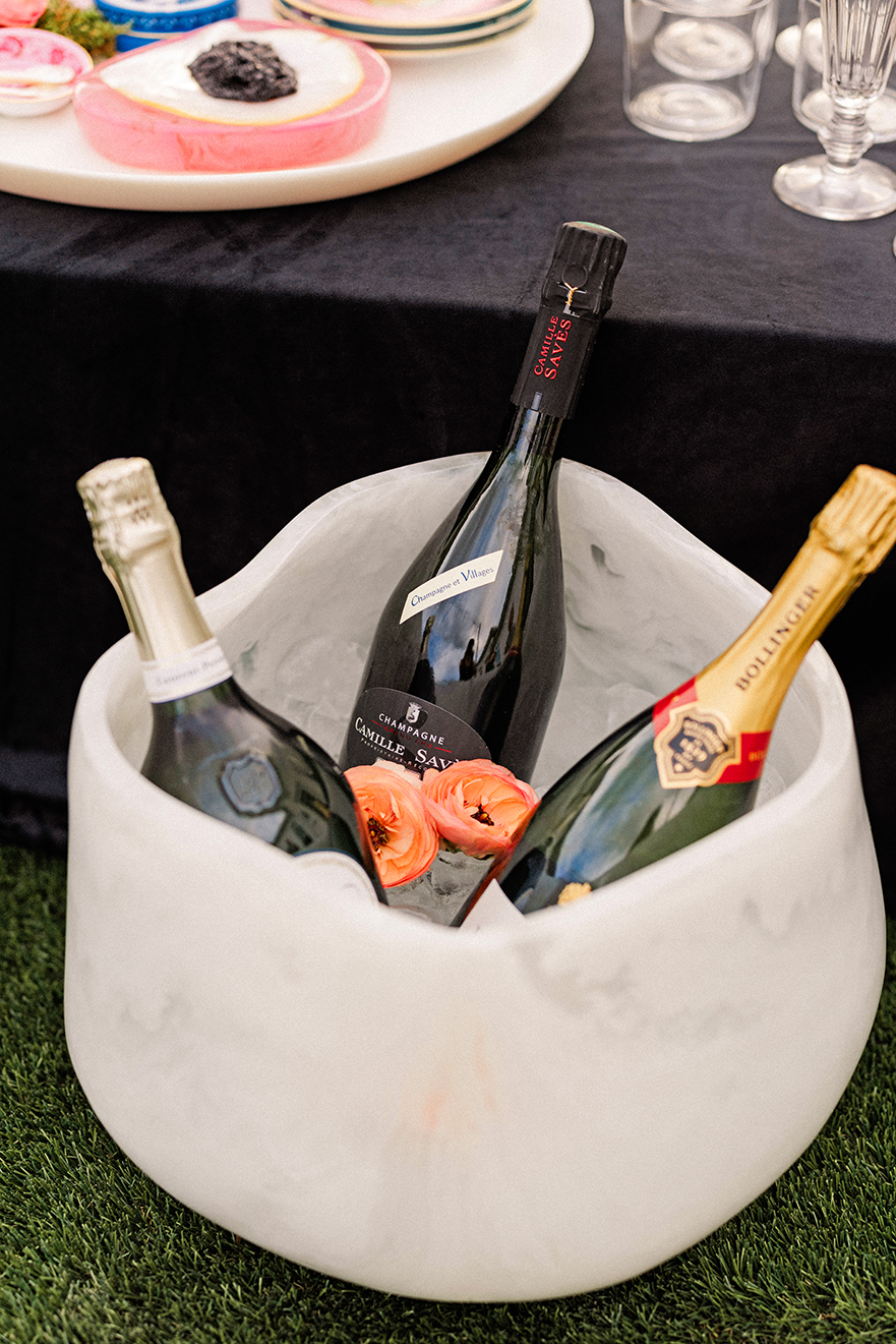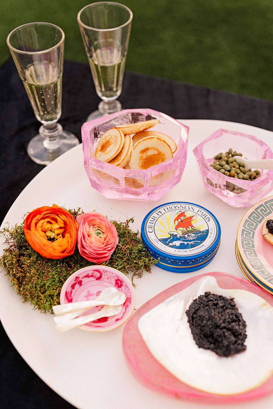 Turkey is not on the menu for this lighthearted take on Thanksgiving. Instead, to coincide with the vibrant tablescape, event and floral designer Angela DiVincenti Babin assembled a selection of light fare that keys into the effortless coolness that was the guiding principle for the entire design. And nothing is as cool as a course of caviar and Champagne.