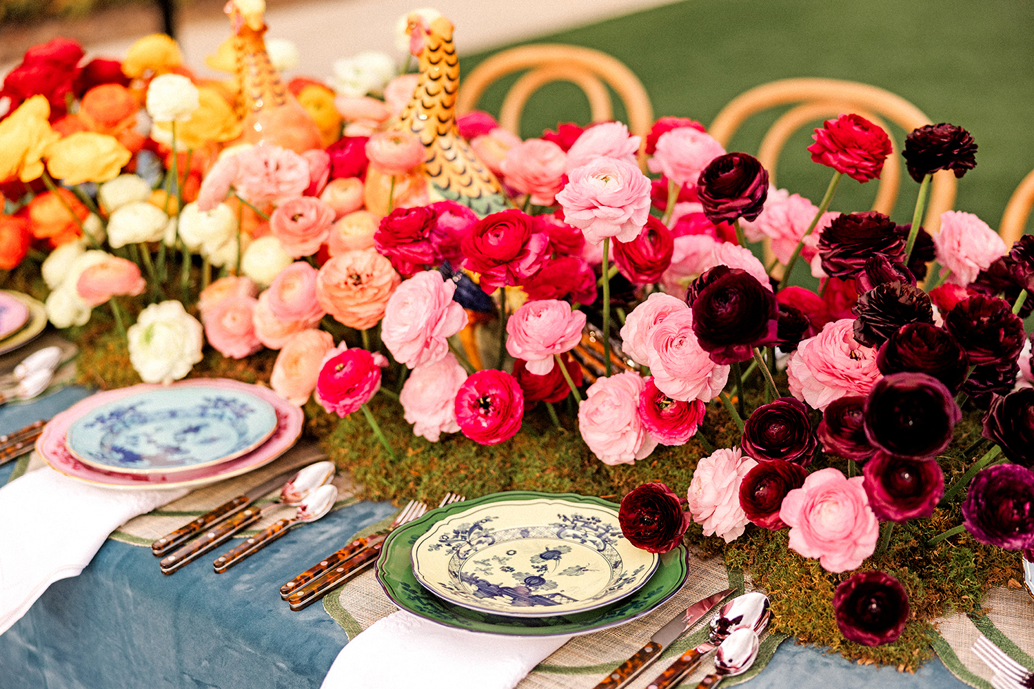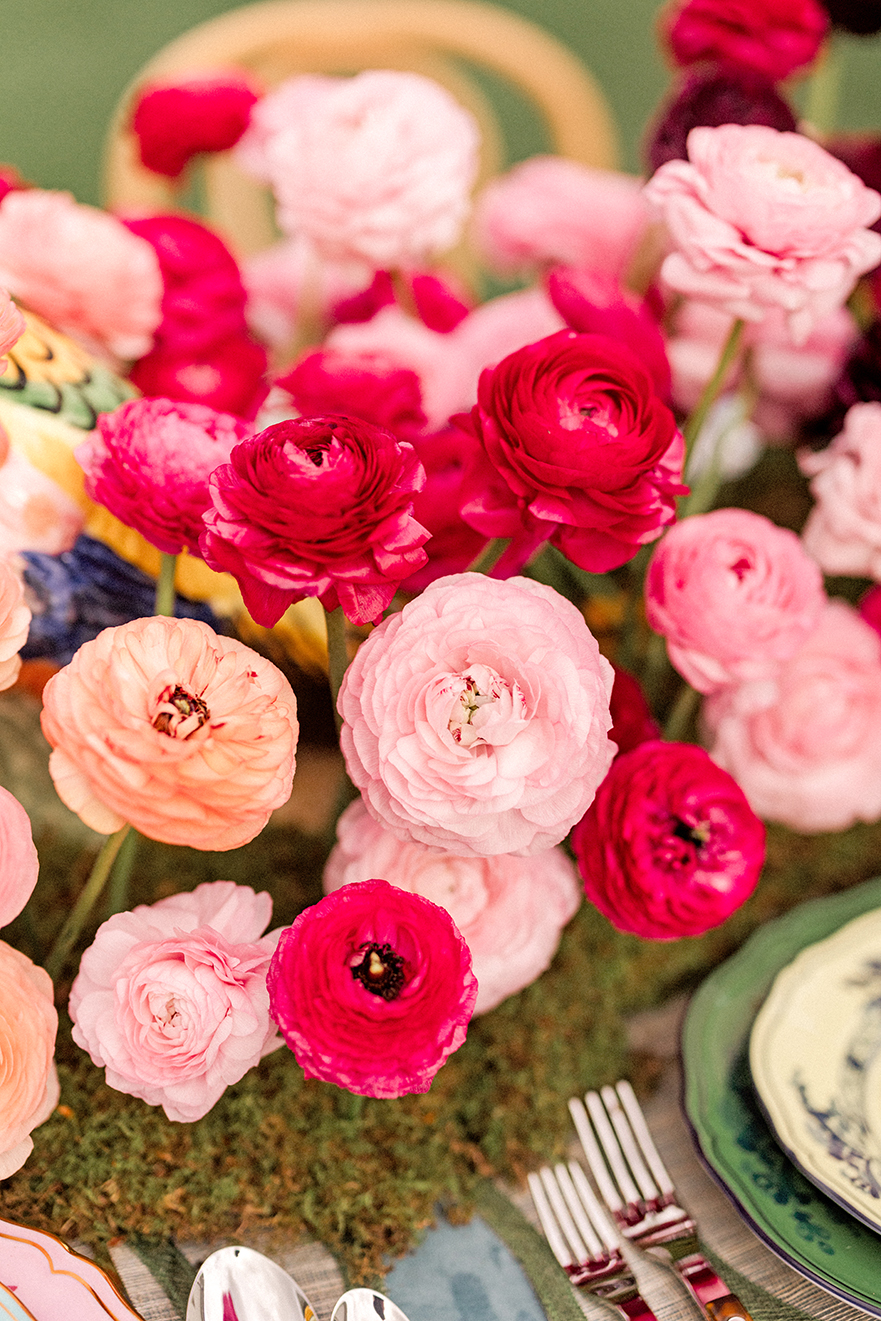 The centerpiece of this Thanksgiving table, made up of an array of nearly 200 vibrant ranunculus blooms, is just the start of the bright details that set this spread apart from others designated for the same holiday.