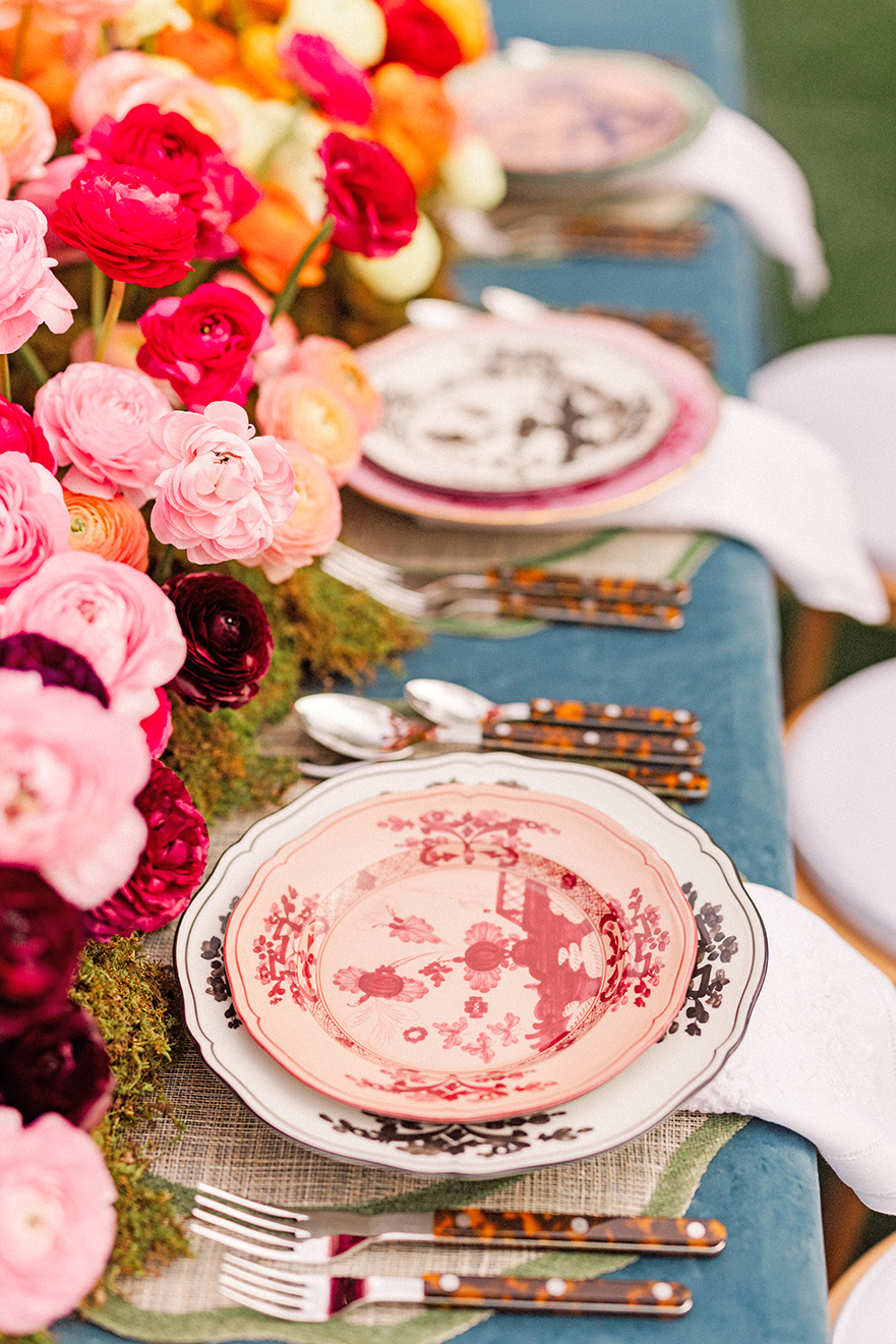Striking a balance between fun-and-fresh and tried-and-true was key for Babin. Enlisting the help of local shop Gourmet Girls, she adorned the table with Ginori 1735 “Oriente Italiano” dinner and salad plates in nearly every shade available. By mixing and matching, no two settings are the same. This gives each guest a place that seems specially made for them.