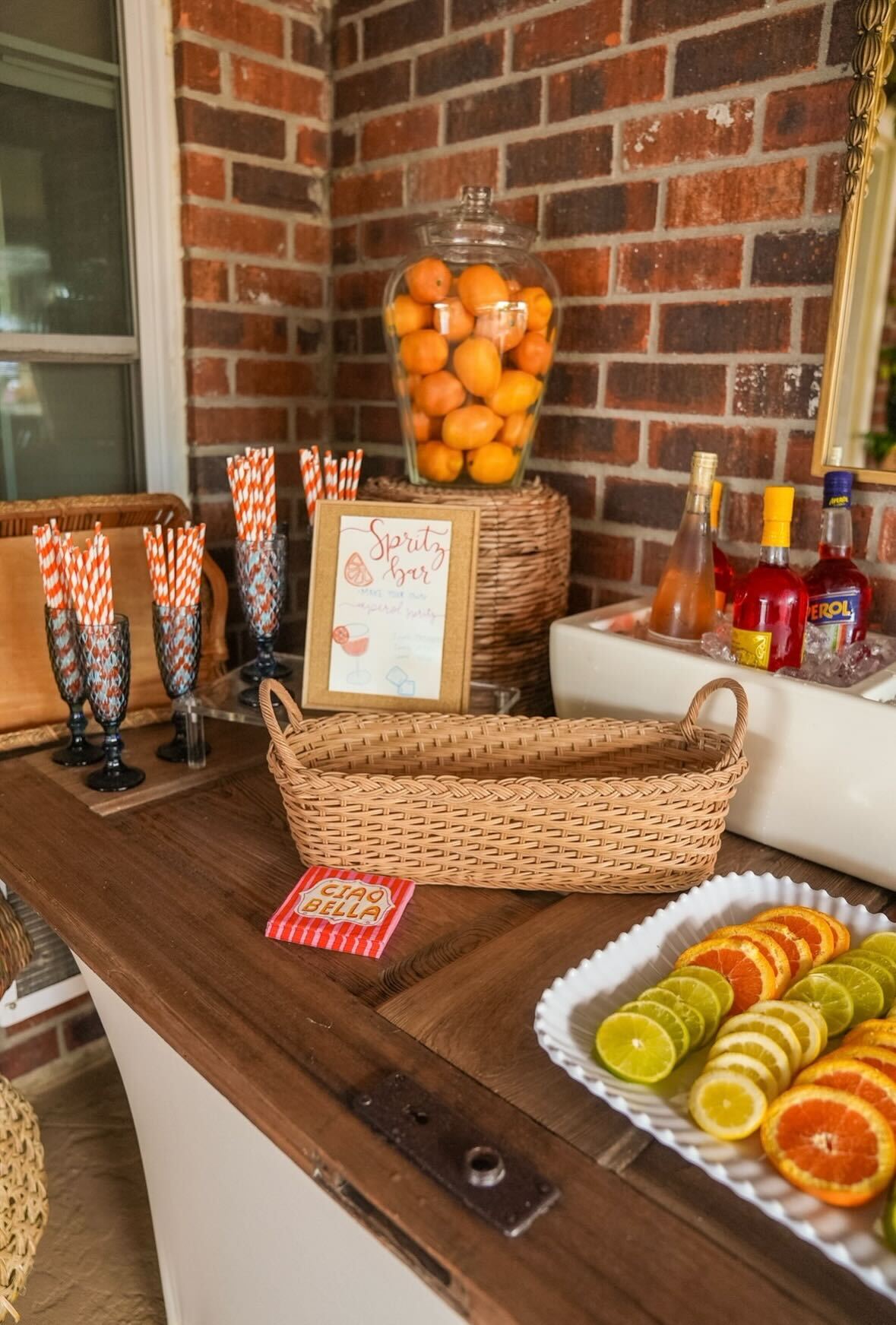 Guests were greeted by an Aperol spritz bar made from an old door and a display of the bride’s homemade favorites: her mom’s pasta salad, her dad’s grilled chicken and, of course, Italian meatballs, which were decorated using various fruits and flowers atop light blue and white striped linen tablecloths.