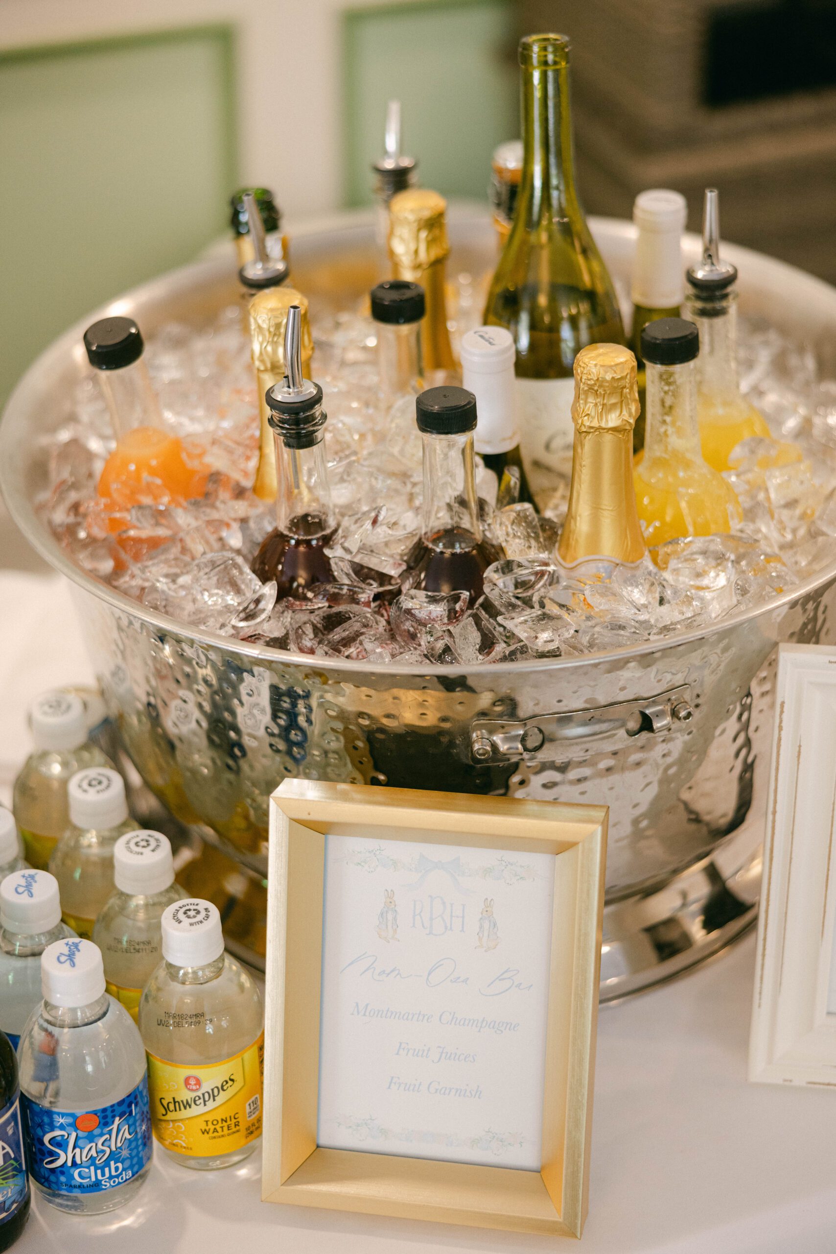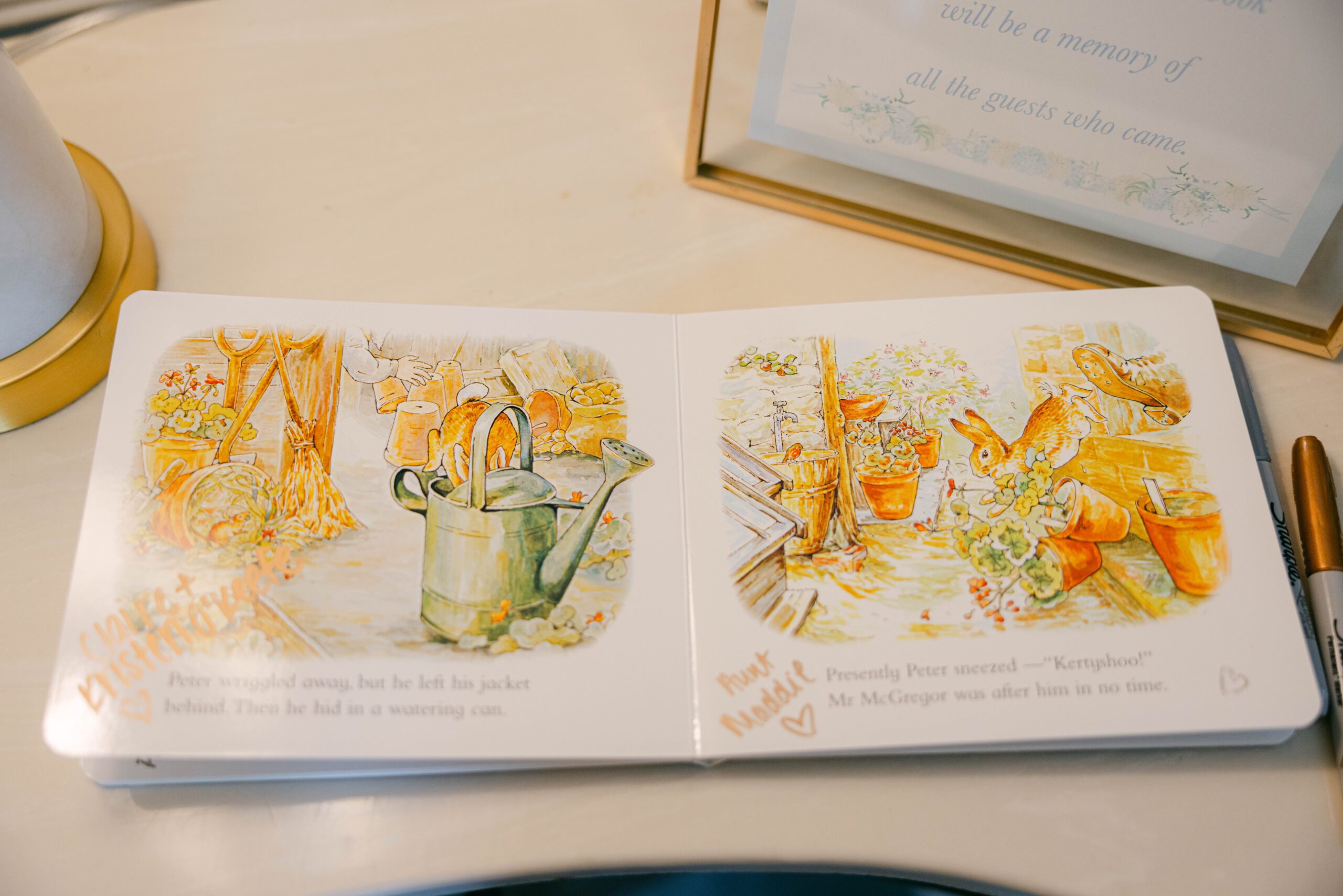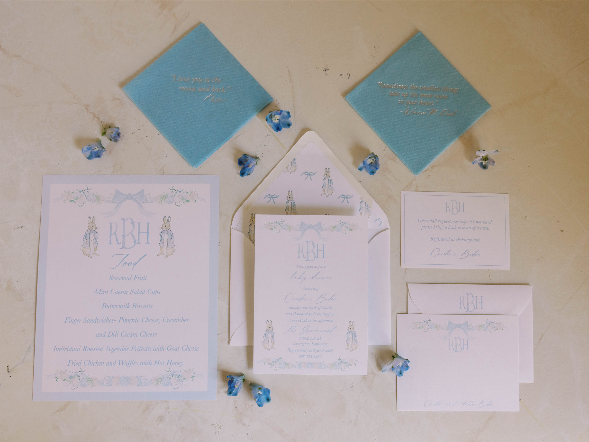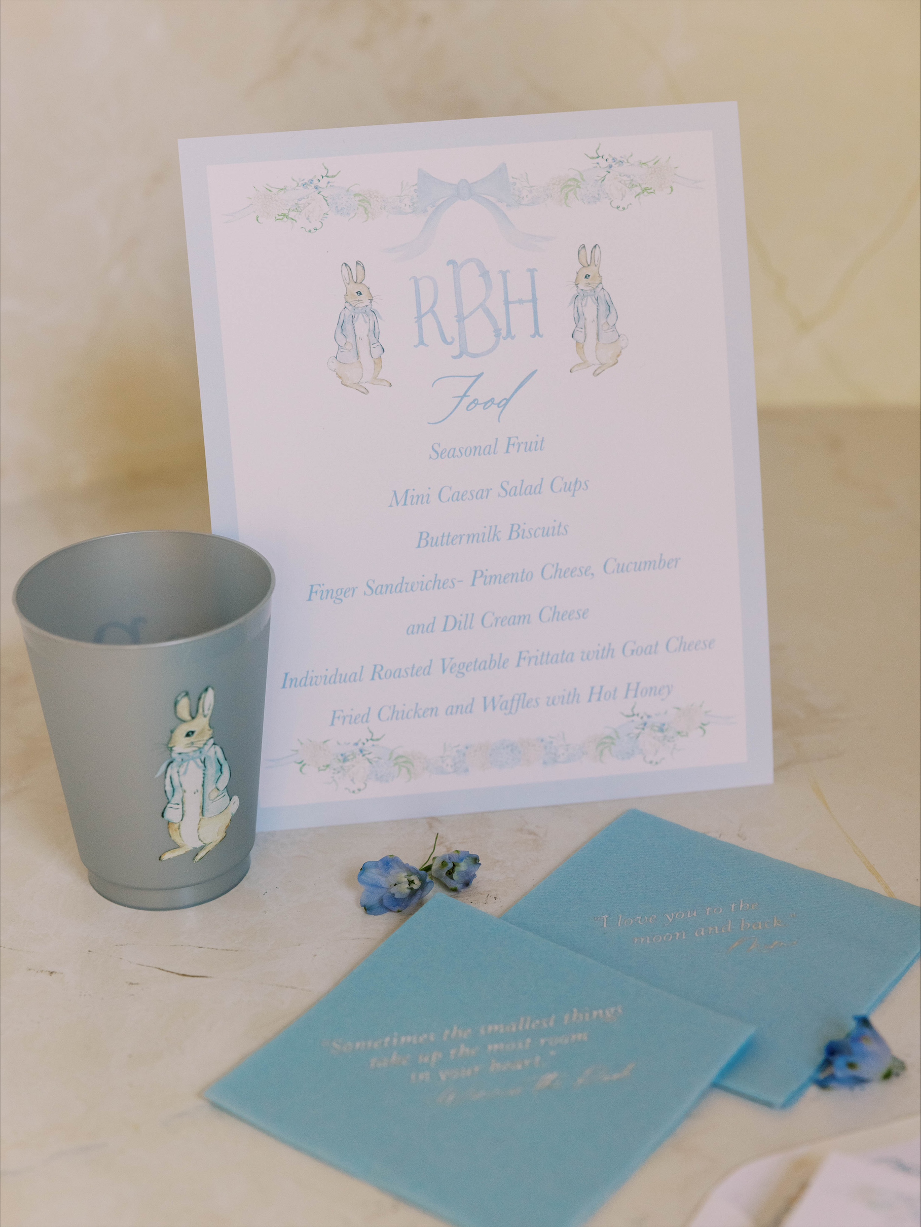 The celebration also included an interactive floral bouquet bar for guests, an acoustic guitarist for entertainment, cocktail and lunch napkins with custom watercolor designs and sentimental quotes, a Peter Rabbit sign-in book and more.