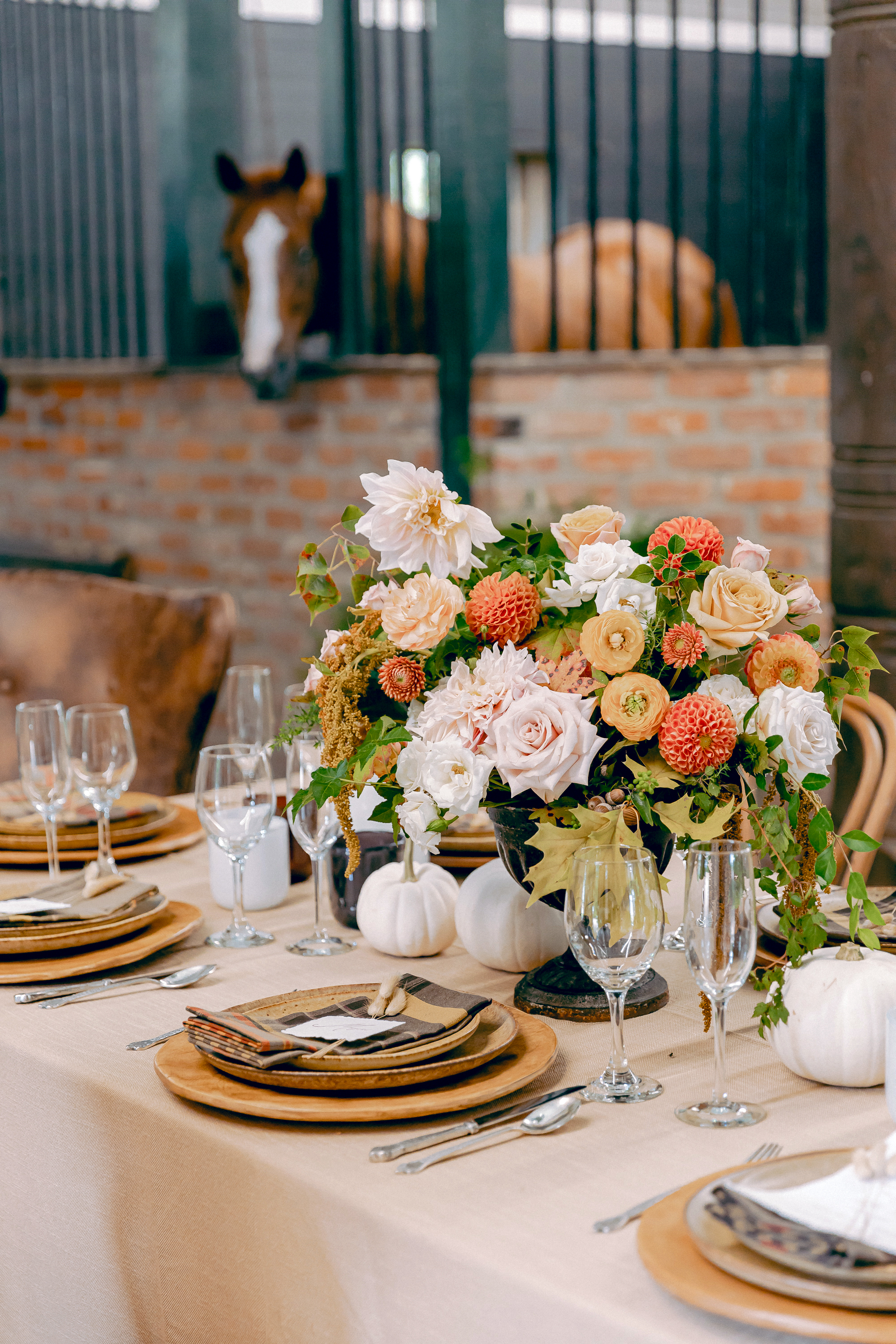 Endurance. Affection. Empathy. Sounds like the perfect ingredients for a Thanksgiving celebration that comes after several long months of keeping our distance from friends and family. So inRegister asked event planner and floral designer Angela DiVincenti Babin of Angela Marie Events to create a fanciful holiday gathering set right in the midst of these beautiful creatures. At Live Oak Arabians, a sprawling ranch that stands as a respite in the heart of the city, Babin planned a holiday scene that’s equal parts rustic and refined.