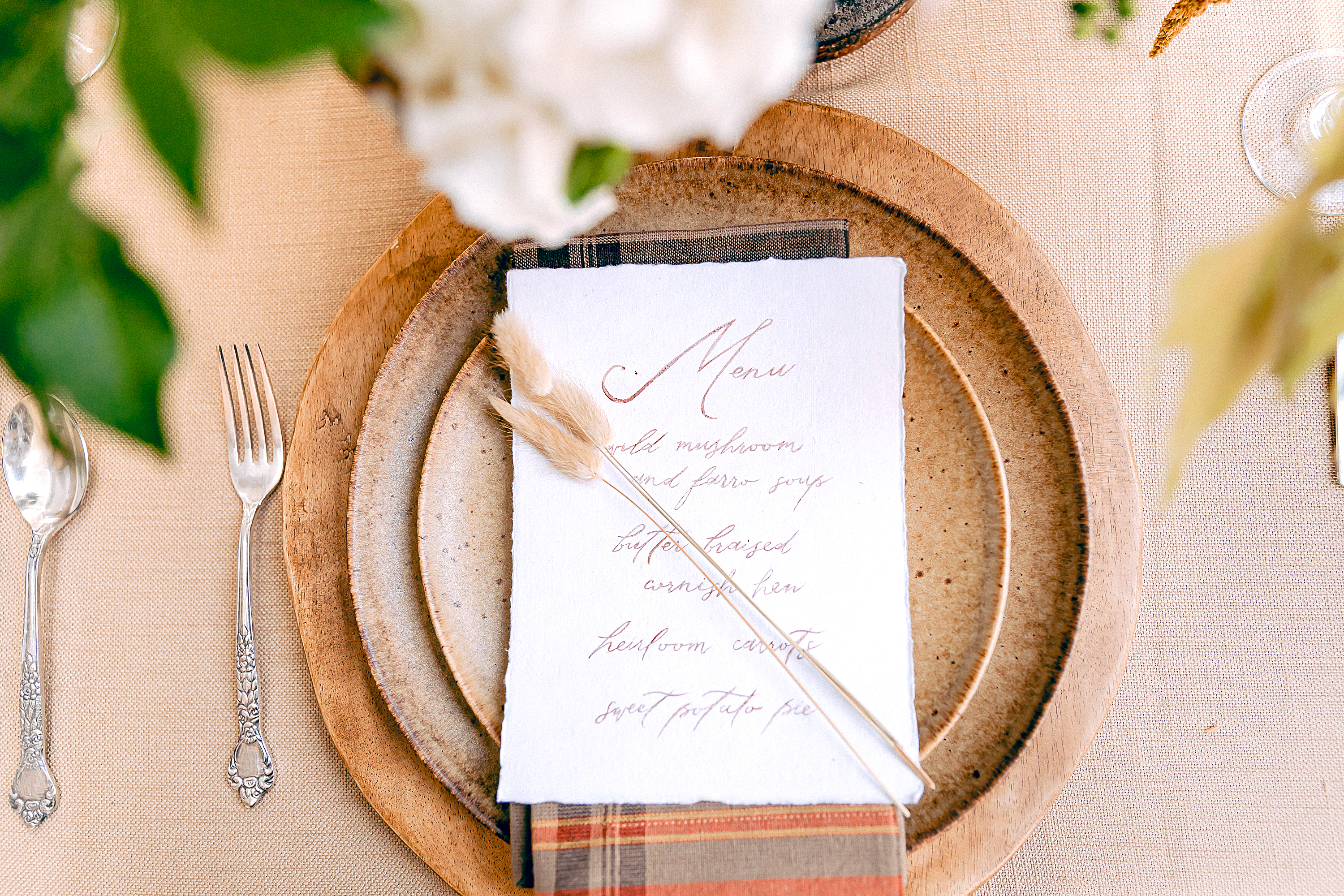 Babin has opted for casual pieces on which to serve the food and drink, making this a no-fuss feast befitting its surroundings. Stoneware plates from Macy’s can transition easily from everyday use to Thanksgiving, and wood chargers echo the tones of the massive columns that flank the table. Plaid napkins from Pottery Barn give a wink to a Ralph Lauren-esque equestrian style, and hand-lettered menus and place cards on deckled-edge paper spell out the fact that these festivities are anything but fussy.