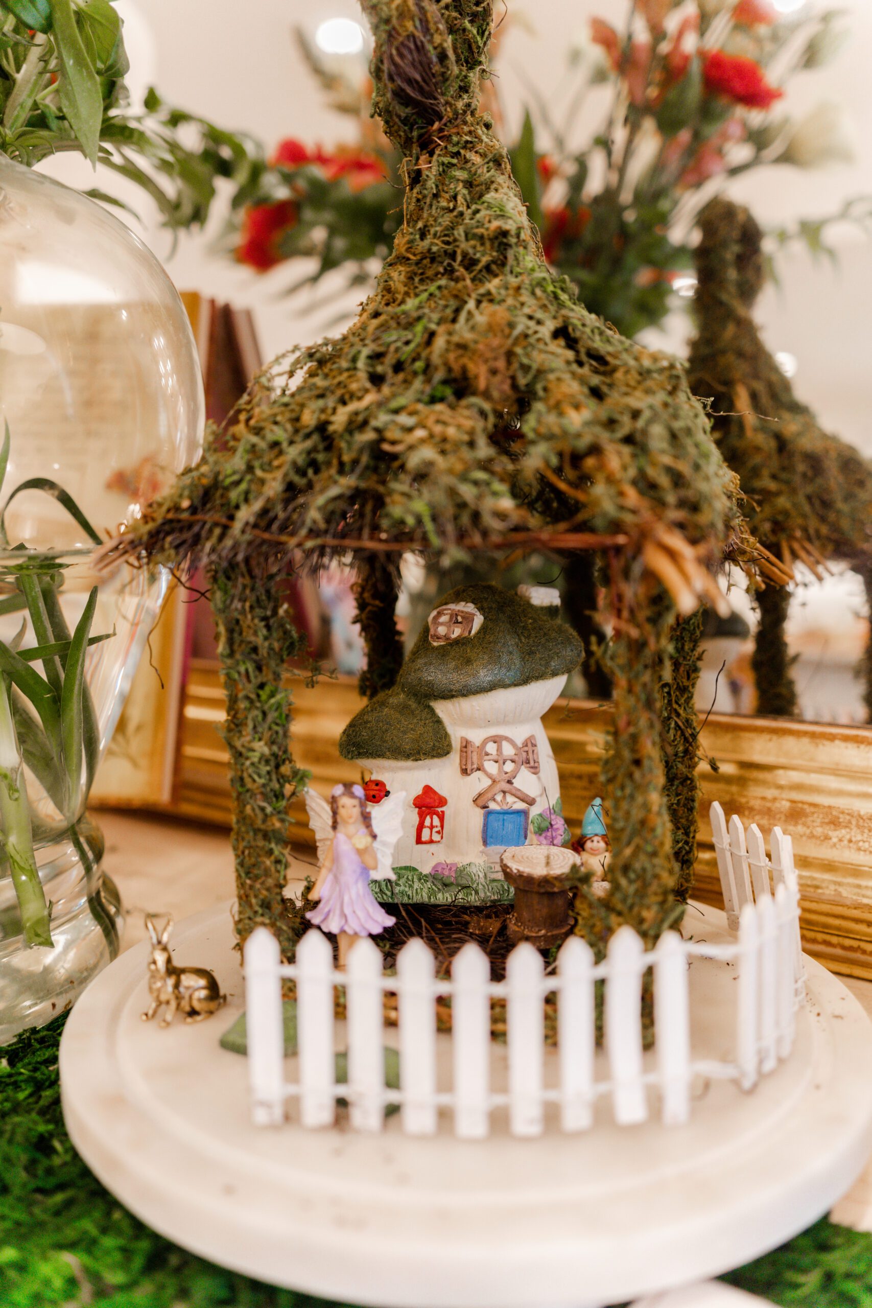 Because Katherine has a little spunk, Knaps leaned away from pastels and into a brighter color scheme for the rest of the décor. She used pinks and greens to match the mosses and butterflies, along with some red to coordinate with the classic toadstools found in every fairy garden.