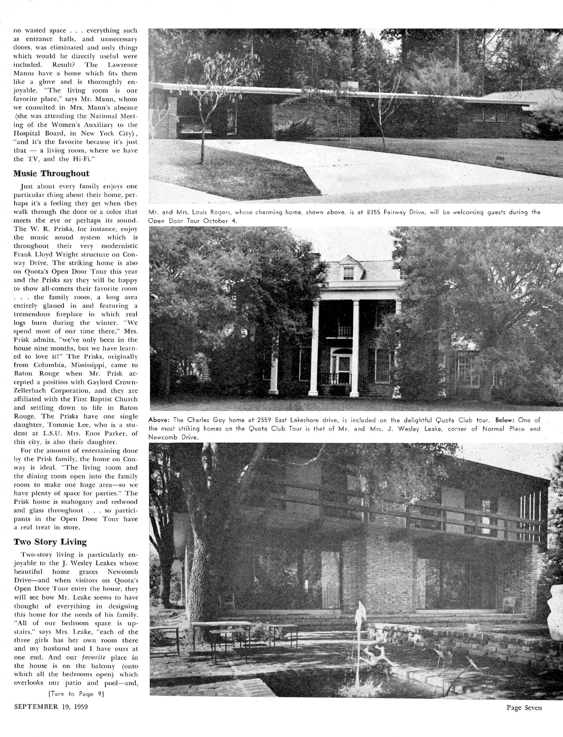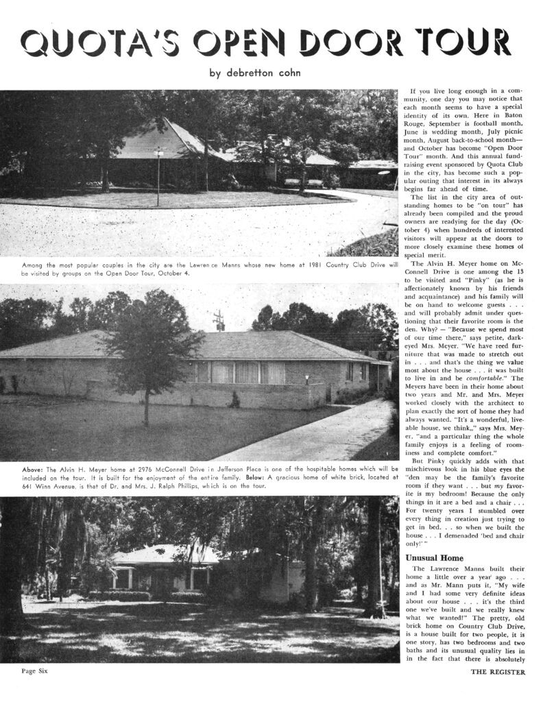 No two families are the same, so neither are the homes they create. And few things are more fascinating than a peek at how people design their spaces for everyday life. Leveraging this curiosity to benefit the community, the longstanding nonprofit Quota BR once hosted its annual Open Door Tour each October, offering a glimpse into 13 of Baton Rouge’s most unique homes. October of 1959 was no exception, and the September 19, 1959, issue of The Register provided riveting previews of each home included in the tour.