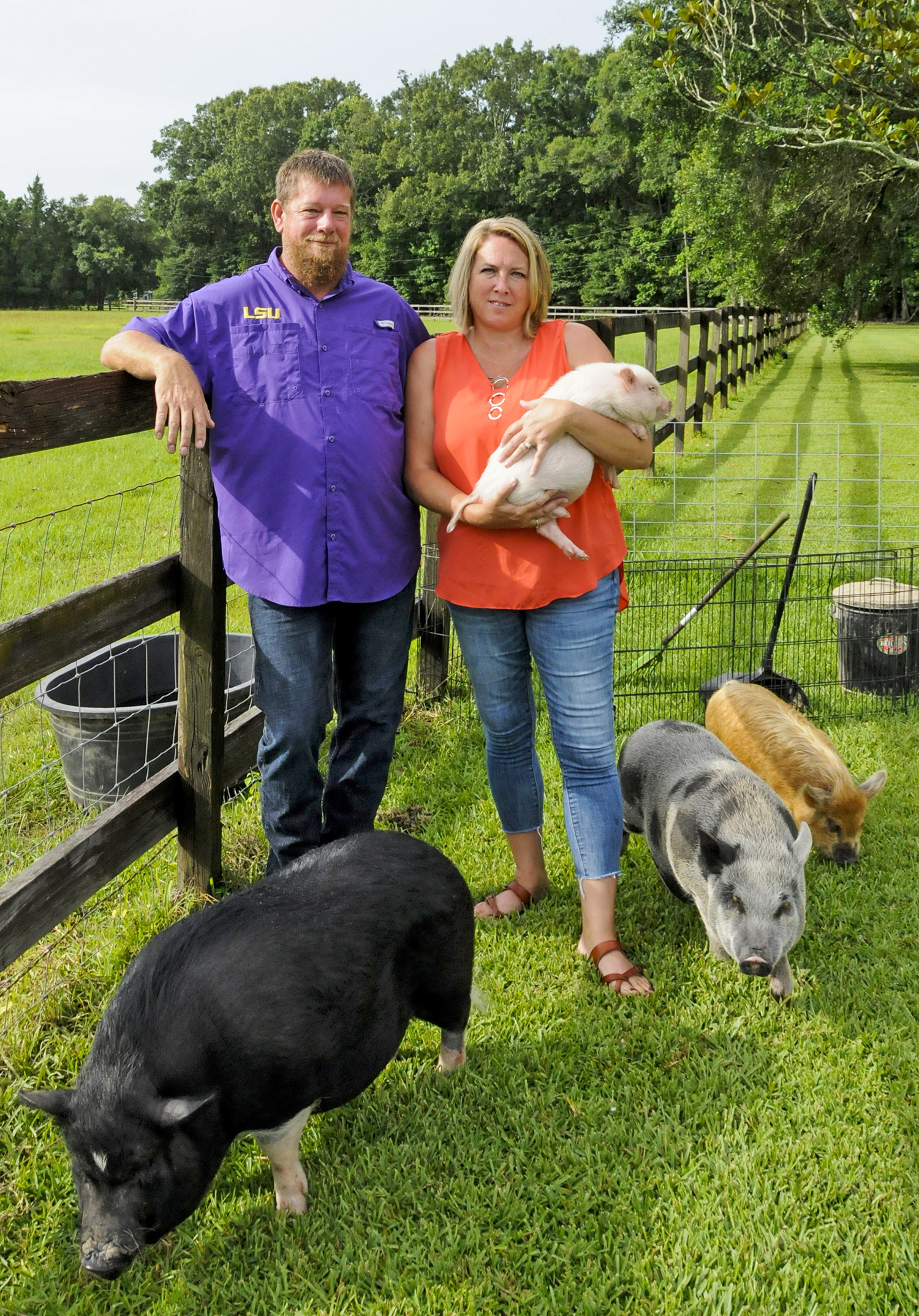 Every few weeks, Theresa and David Hawkins set off to scour thrift stores across Baton Rouge for blankets and sheets. Printed with everything from forgotten cartoon characters to faded paisley, the discounted linens won’t be finding their way to beds or couches. Instead, they’ll soon fill barn stalls and shaded corners on the couple’s property, known as Hawkins Hideaway Farms, acting as nesting material for a population of about 100 pigs that call the backyard oasis home.