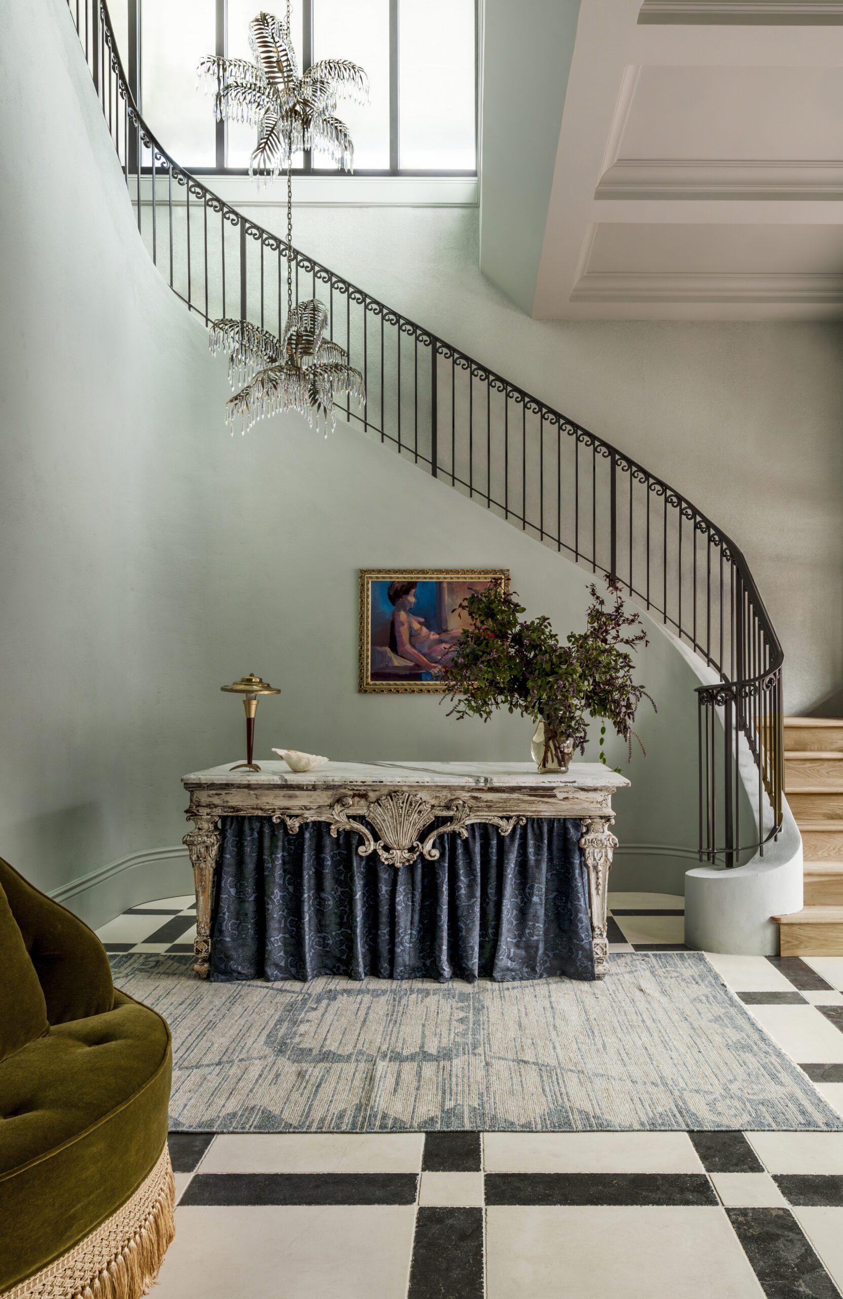 Before the renovation, the area that now serves as the hotel lobby was a gated exterior courtyard. An antique French console with a marble trompe-l’oeil top was retrofitted with a custom Ralph Lauren Home skirt for use as the reception desk. The floor is covered in custom hand-chiseled Belgian bluestone and limestone, and the curved staircase is inspired by old New Orleans homes. Hanging above the desk is a three-tier palm-motif crystal chandelier commissioned from a factory in Venice, Italy.