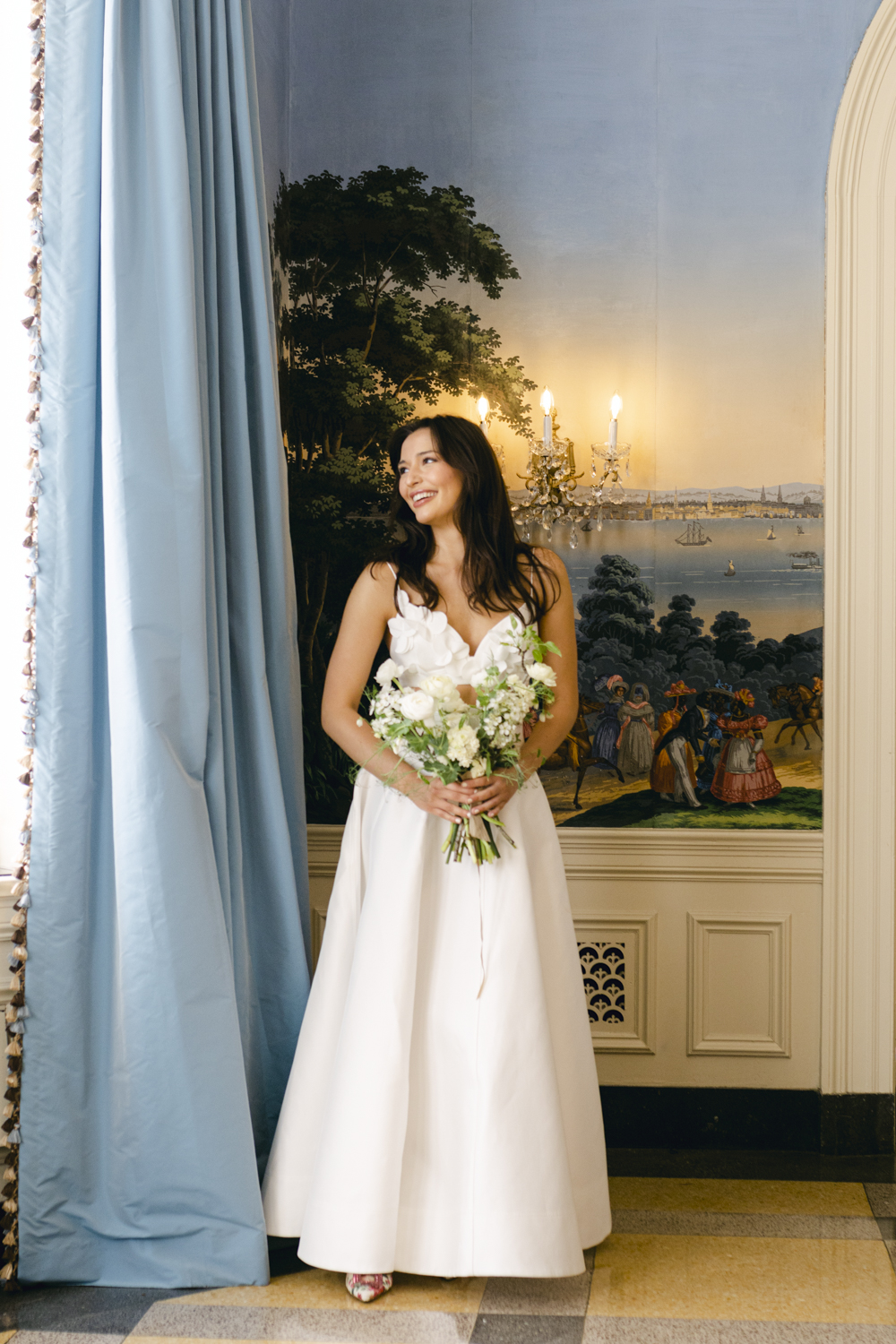 Dress courtesy of Aria. Floral arrangement by Meredith Cooper of Forage Floral Design.