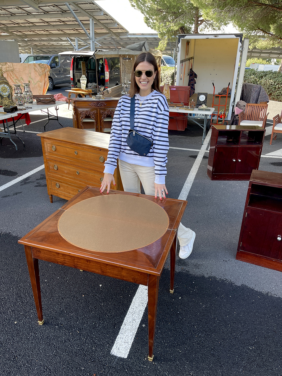 Amongst her favorite markets to visit was the Villeneuve-Lès-Avignon Flea Market (in the beautiful village of Avignon, which she describes as “magical”), where evidence of classic French charm was on full display: people cracking open fresh oysters, acoustic French music playing, and Provençal sideboards and landscape art for sale side by side. She scored numerous finds on her trip, including a midcentury sideboard, a nearly 10-foot-tall canvas painting of the Virgin Mary from the 1850s (a particularly fun one for the packers to handle, Barfield laughs), a demilune game table with a checkered inlay, vintage gilt-leafed sunburst sconces; and a sunshine-hued bouillon-fringe slipper chair.