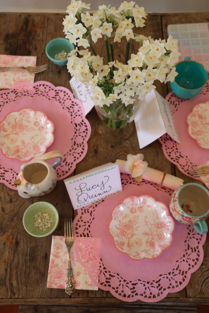 Lucy’s grandmother, Darlin, giggled and said she thought it was the first time she had used her good China tea cups, but there was no better time to use them than for Lucy‘s golden birthday. We used a little fancy with a little easy cleanup! The pink paper plates were from Amazon, along with the pink and white toile paper napkins.