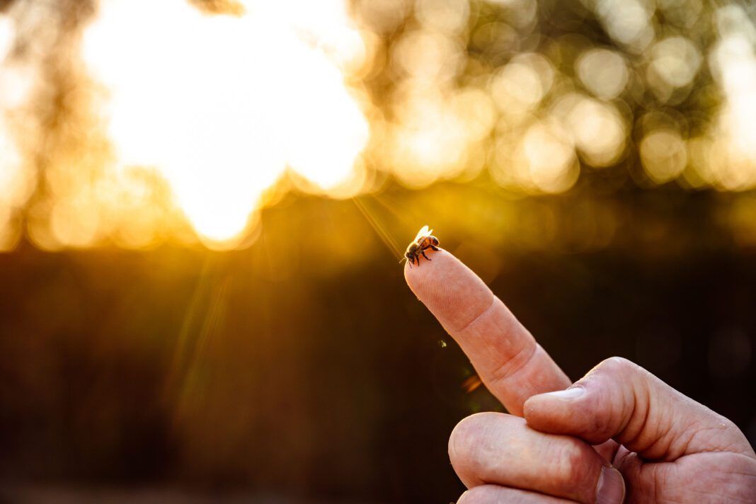 A bee lands on Kevin Langley's finger at Tam Bao Meditation Center. Photos by Jordan Hefler.