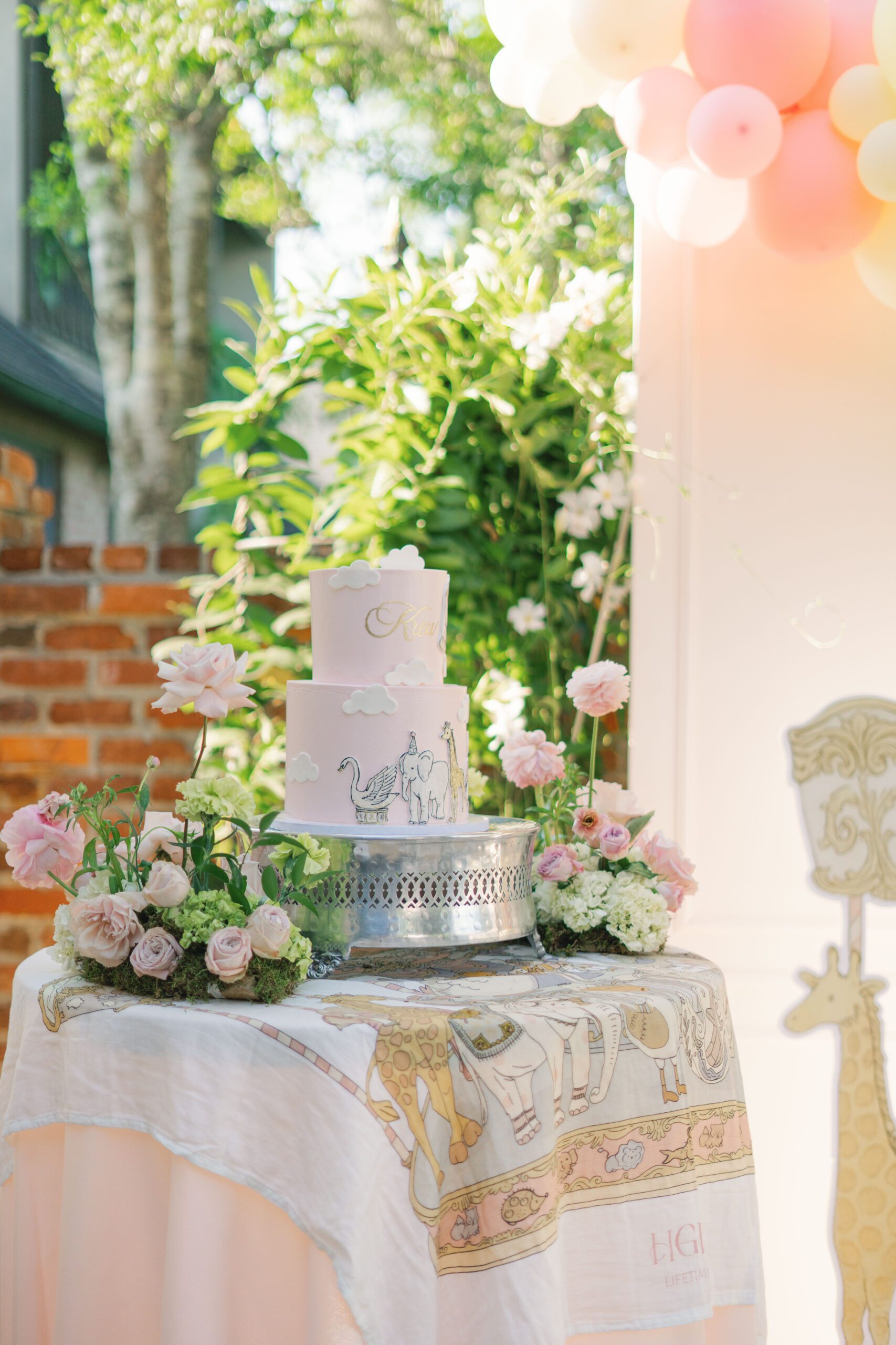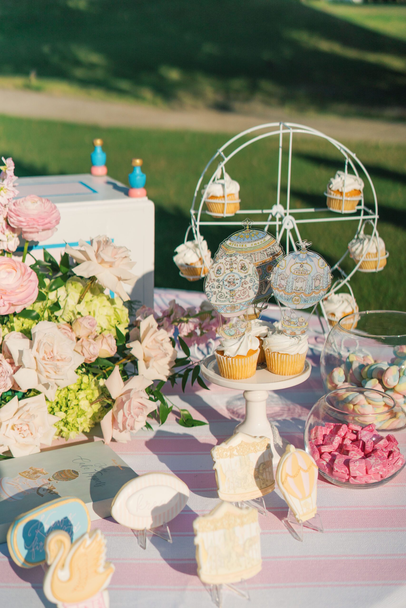 The décor incorporated elements from the swaddle, featuring sweet pastels and enchanting carousel animals. A budget-friendly version of the same swaddle appeared as tablecloths, cupcake toppers and even stuffed animals like the giraffe and mice. And a statement carousel horse stood on top of the sweets table, tying the entire carousel theme together with a touch of Parisian whimsy