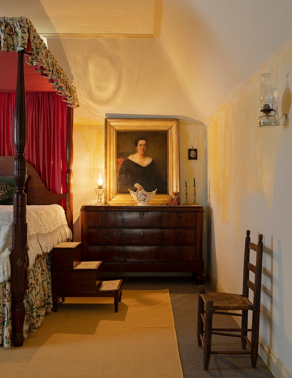 Meanwhile, Jeremy and Lindsay were continuing to write their own story at home by conjuring rooms as immersive as a Disney attraction. An empty guest bedroom upstairs became the perfect canvas for Jeremy to create the look of an old plaster and bousillage house as it would have looked in 1880s Louisiana. This “time capsule” space, with its walls carefully faux finished by Jeremy, contains a mix of fine antiques and more primitive and practical pieces. “I was initially inspired after reading a 1928 Scribner’s Magazine describing an old Creole cottage in Natchitoches with ‘mud walls,’ also known as bousillage,” Jeremy wrote in an Instagram post about this room makeover project. “In this small 18th-century house lived a cousin of my great-grandmother’s.”