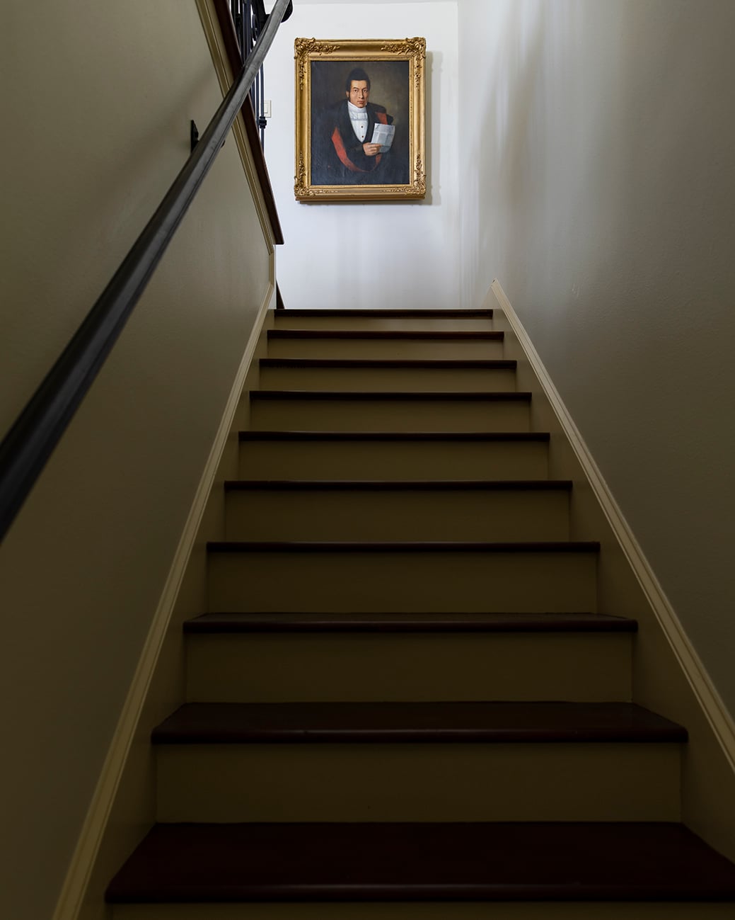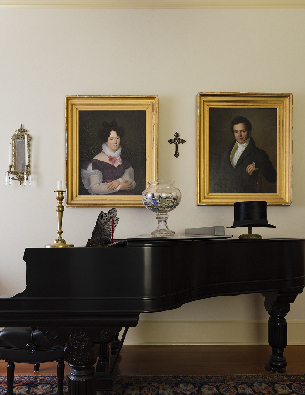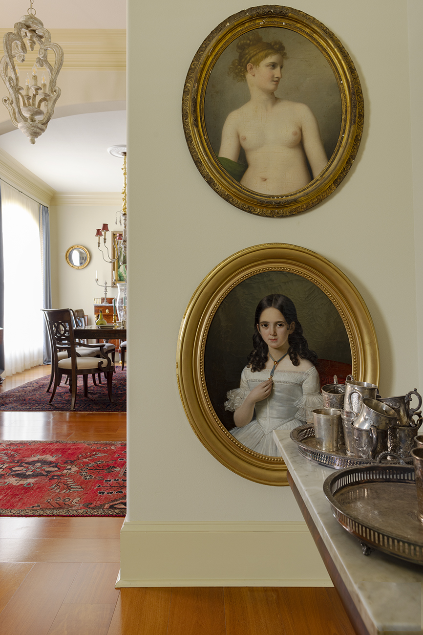 One of the first portraits he acquired was a painting of a Southern lady wrapped in an indigo-colored shawl. “At the time, I didn’t know what time period it was from, but I knew it was old,” he says. After the purchase, he learned that the original frame had been replaced, making the painting less valuable. But, he felt a connection to the portrait’s subject nonetheless, and the work still holds pride of place among the many he has since amassed.