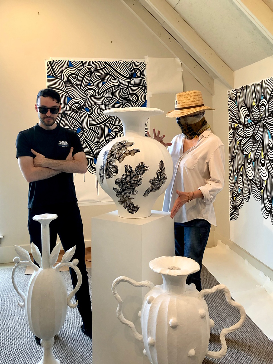 (right) Recently, Röhlen’s larger-than-life lines have shrunken down, making their way onto pottery in one of his projects in Italy in 2022. Courtesy Simon Röhlen