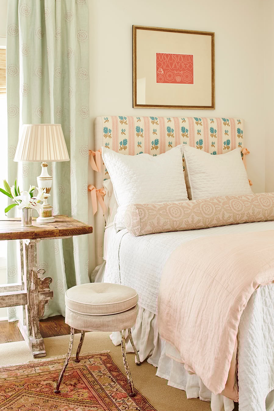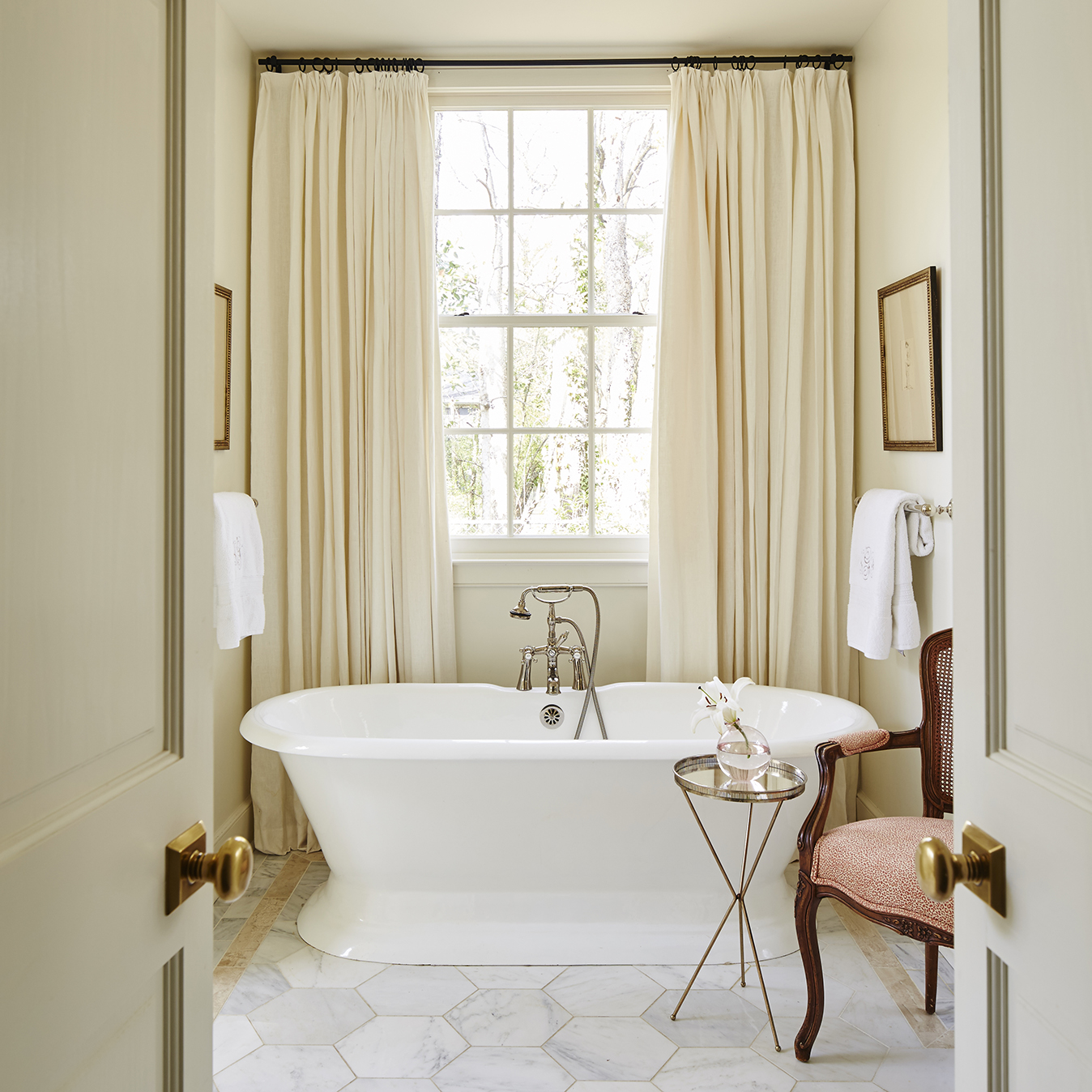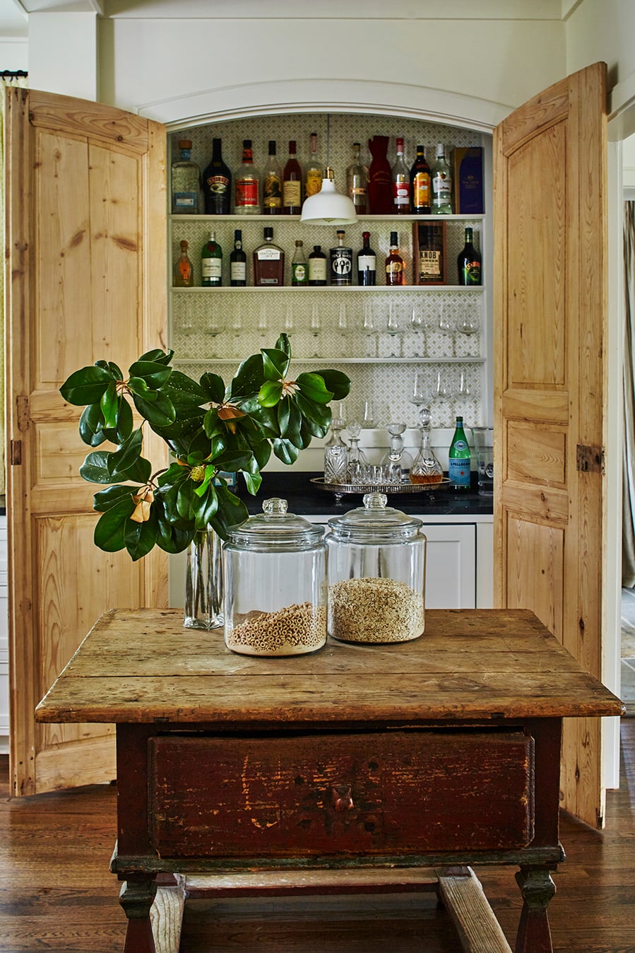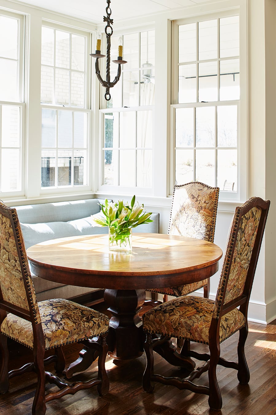 “Dining rooms tend to be massive holes for every piece of dark wood furniture in a house,” Gilbreath says. “Anywhere you can introduce contrast brings the formality down a little bit.” To shake off the mahogany curse, she threw in a contemporary white table along with classic Southern pieces including cane-back chairs and an antique armoire.