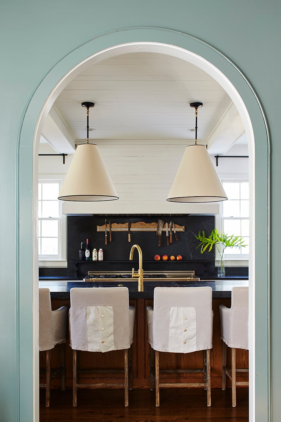 An old-world-style range by the Italian company Ilve features brass accents that are repeated on the faucet and cabinet pulls. “Barrett’s the cook in our house,” Gilbreath says. “I can scramble eggs, and that’s about it.” Soapstone countertops, maple wood on the island, and a shiplap ceiling add to the mélange of tones and textures.