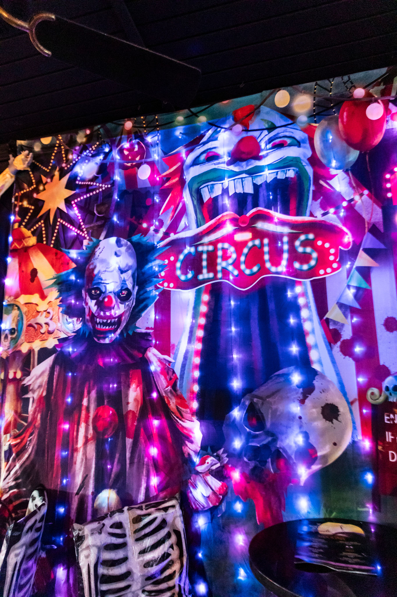 The 5,000-square-foot bar is decked out with decorations straight out of a horror film. Ghastly monsters lurk around every corner of the bar and each section has its own theme, like a carnival area filled with not-so-friendly clowns and a Nightmare Before Christmas-themed room complete with a towering Jack Skellington figure that had to have its legs cut down in order to fit in the building.