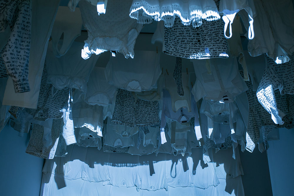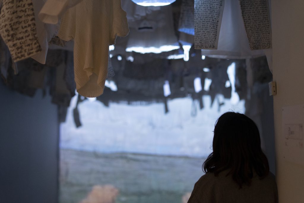 The moment I turned the corner of the fifth-floor gallery, I found myself thinking, “Well, this is unexpected.” I began physically ducking under lines of laundry and watching a video of a man’s view from swimming in open water on a reel. Typically I don’t enter a yoga class and have to careen my way around clotheslines and vivid projections, so I knew I was out of my element.