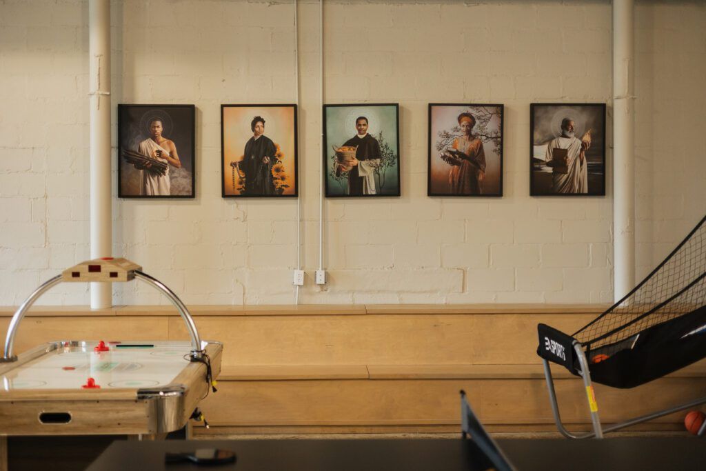 Under the direction of Father Joshua Johnson, the formerly vacant paint shop has been completely transformed over the past months to make way for a multi-faceted meeting space catering to those within the geographical boundaries of Sacred Heart parish, as well as parishioners, new community members, visitors and anyone else who might find themselves on Main Street. The space, which was reimagined by Scheffy Construction and Ritter Maher Architects, now houses a new and improved food pantry, a coffee bar and workspace, meeting rooms, games, comfortable seating and plenty of artwork. The coffee and workspace is open daily for anyone and everyone to enjoy. The meeting spaces are now the backdrop for Bible studies and other get-togethers. And, most notably, the facility provides a home for the local Vagabond Mission, which serves teens in the neighborhood through weekly programming, including tutoring, games, mentorship and more.