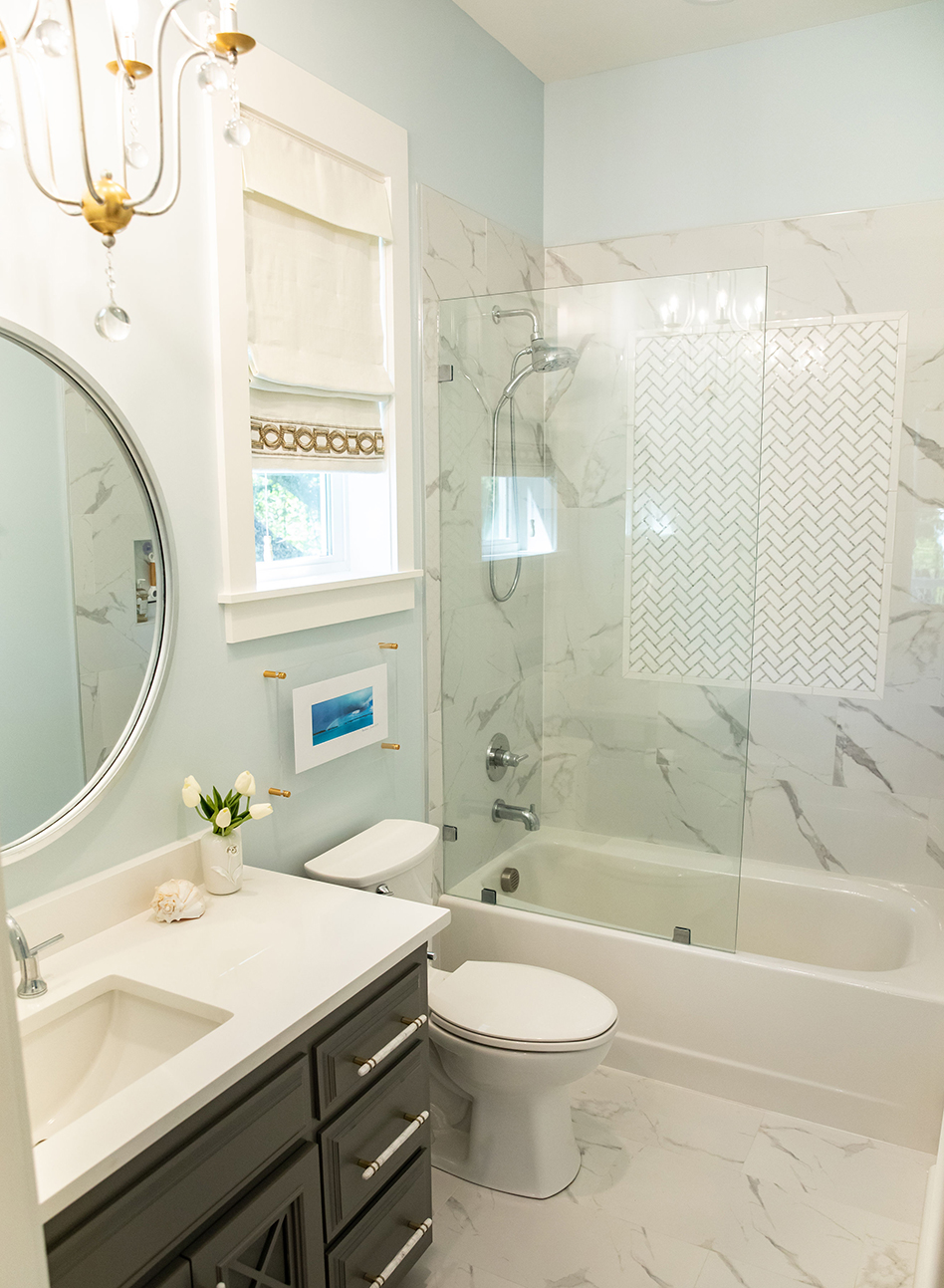 “I love how we incorporated blue in the kitchen,” notes Giffel. “We added a light blue glass tile in a chevron pattern to the front of the island. You can see the island from the front door, so it was a nice touch in that way, but it also serves a practical purpose. The tile can be easily wiped clean when scuffs happen from people’s shoes hitting the front of the island.”