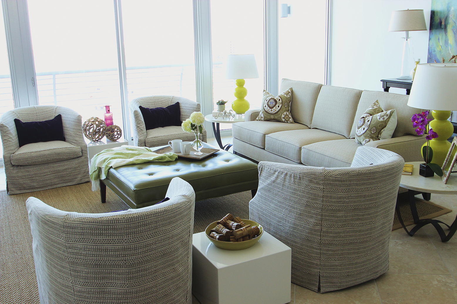 Instead, the designer selected a color scheme that’s subtly evocative of the outdoors, with varying shades of green, tan and gold against a pale background that doesn’t distract from the view. “There are only small infusions of patterned fabrics,” she says. “The design is meant to be restful.”