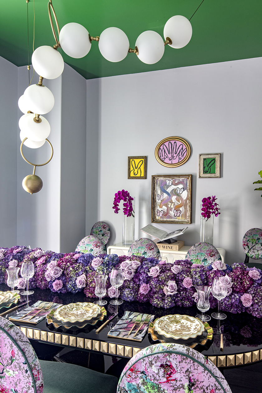“Originally, we were both unsure about using purple since it’s not what either of us normally prefers,” Glover says of the hydrangea-laden runner that makes a statement across Polito’s dining room table. “But for this, it was all about making the design pop, and the purple flowers were definitely the right choice for that.”