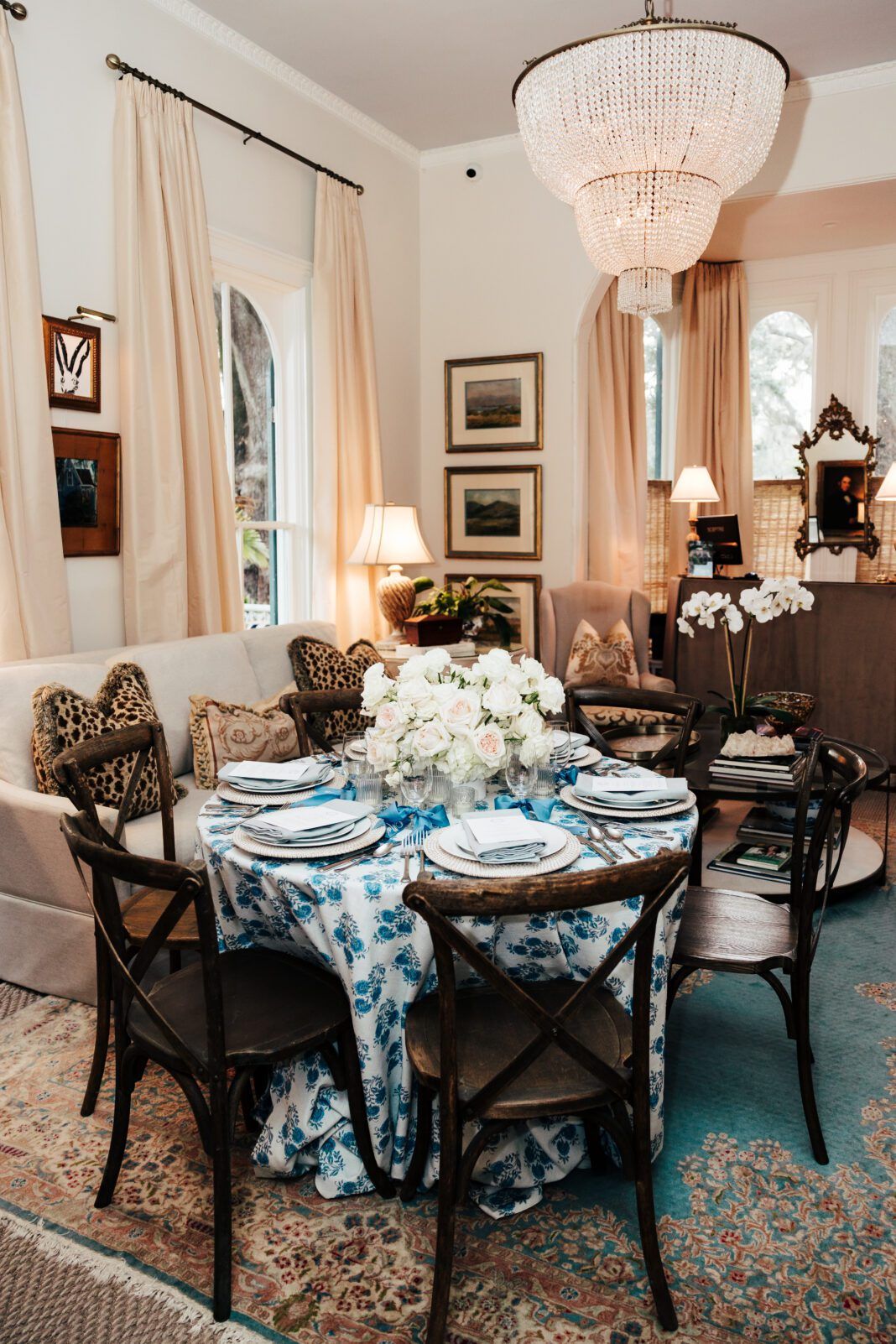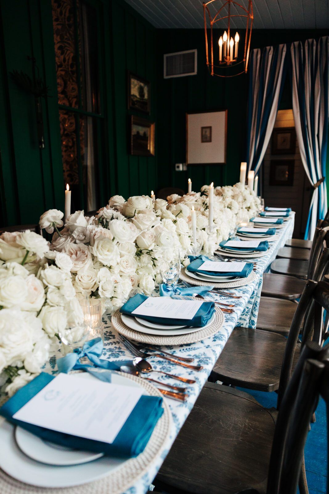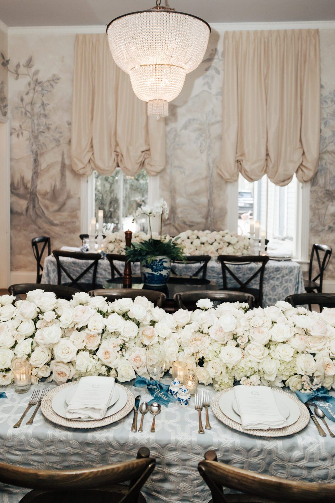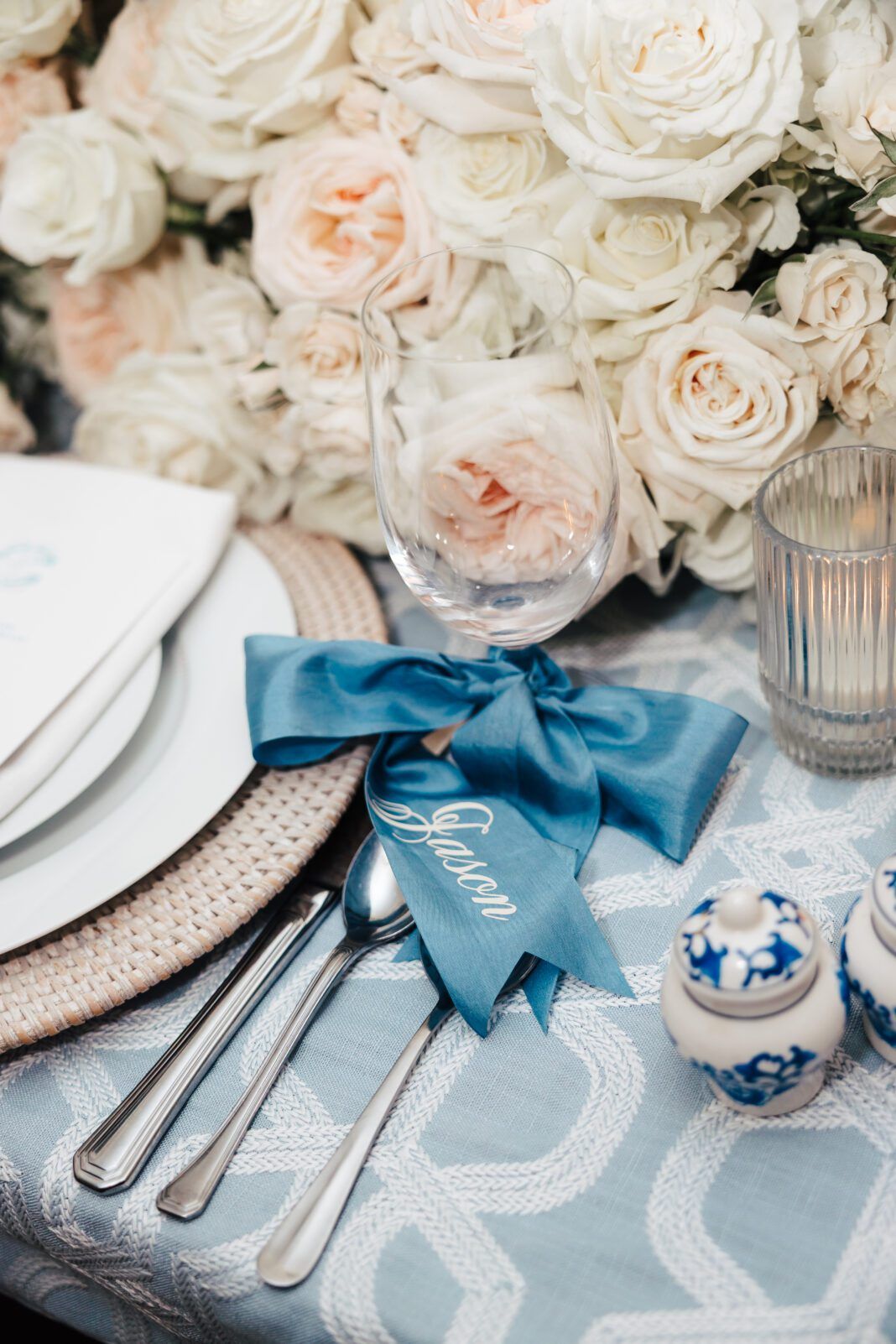 After the ceremony, the group moved to the St. Francisville Inn—itself a historic building constructed in 1880—for a seated wedding dinner. Here, Babin dressed long tables with tablecloths in varied blue and white patterns and created loosely mounded centerpieces of white roses and hydrangeas. In lieu of a place card, a blue ribbon with each guest’s name was tied in a big bow around the water goblet at their place. Tall pillar candles and low crystal votives, blue and white porcelain salt and pepper shakers, and whitewashed rattan chargers completed the look.