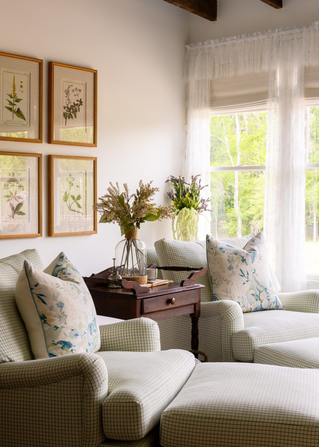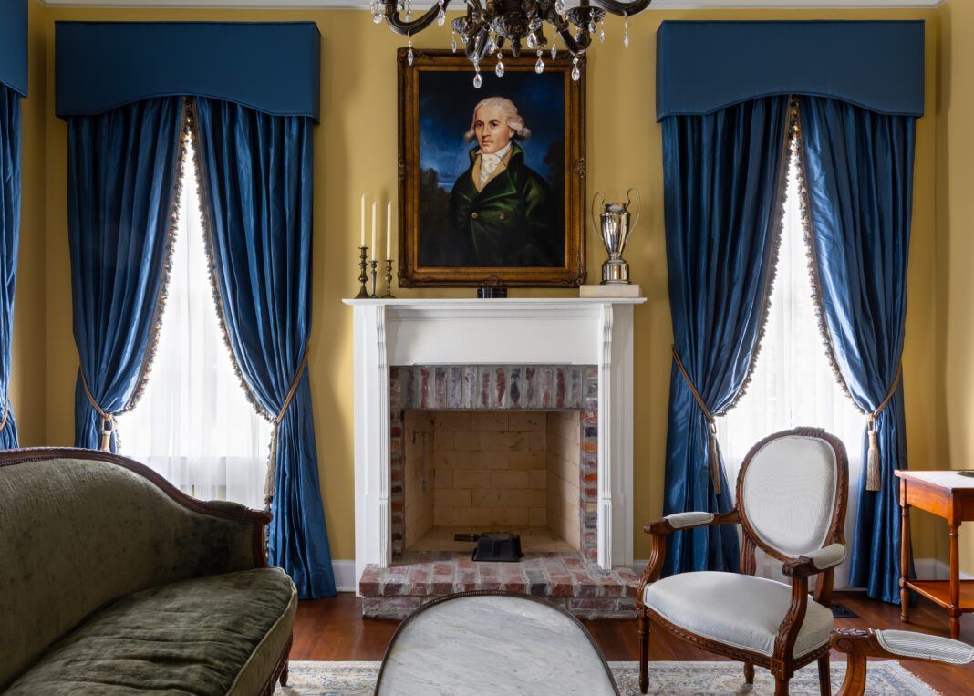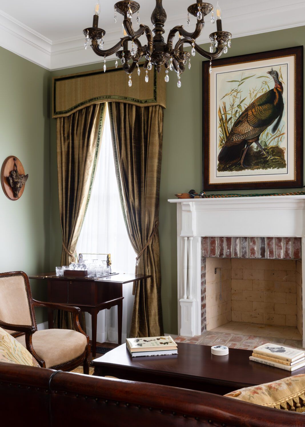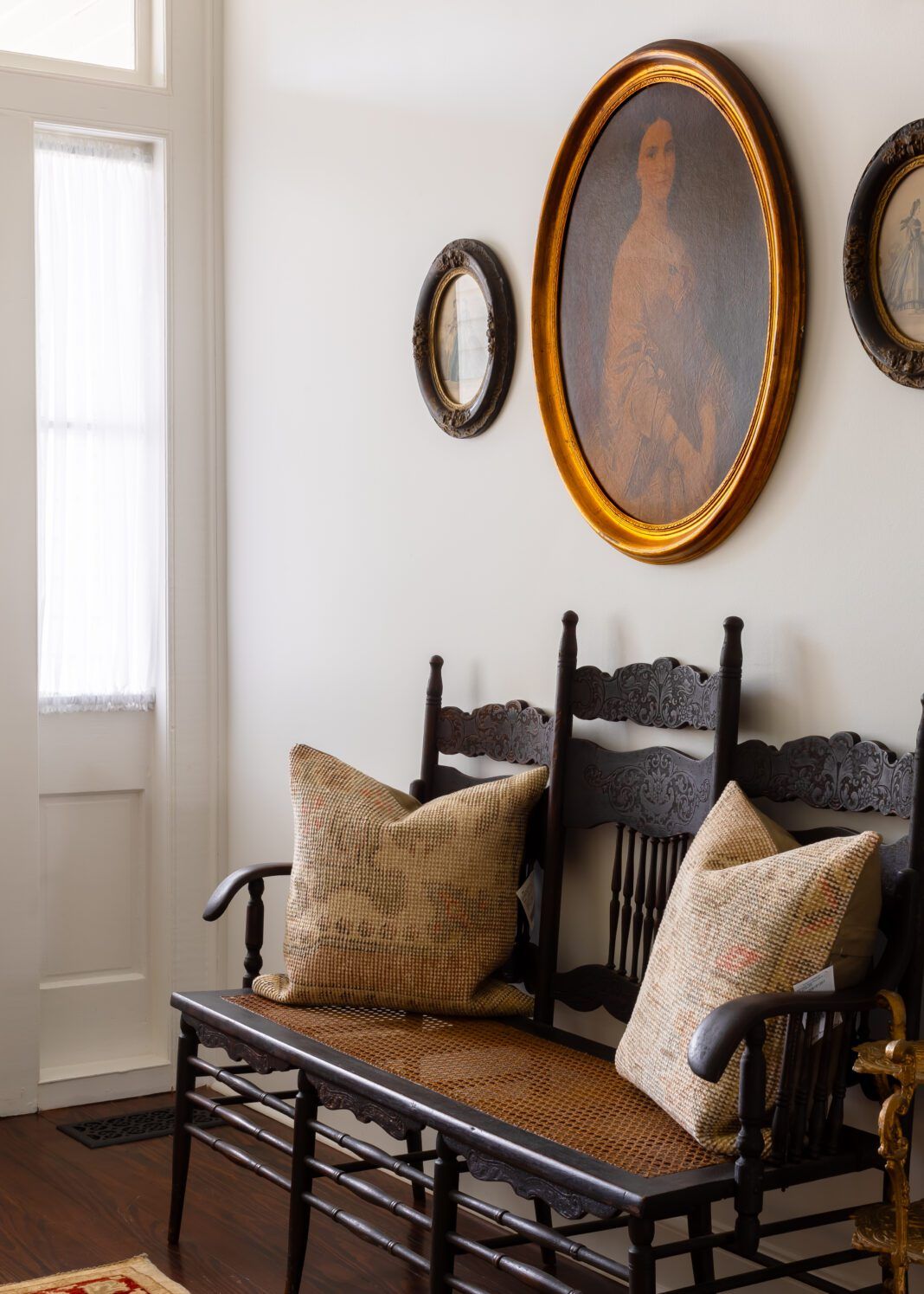 It’s easy to see those odes to Feliciana history throughout the completed house, which was decorated with help from Jana Mistric of Sojourn Home Interiors and Window Treatments. The original ladies’ parlor is home to a portrait of Fulwar Skipwith, who served as governor of the West Florida Republic in the early 1800s when its capital was St. Francisville, and a flag of that short-lived nation hangs in a corner of the same room. Across the main hall in the original gentlemen’s parlor, a John James Audubon wild turkey print hangs above the fireplace. Artworks featuring West Feliciana plantations fill the walls of the primary suite, and a portrait of Philemon Thomas, who served as a military leader of the West Florida Republic, is on display in a hallway.
